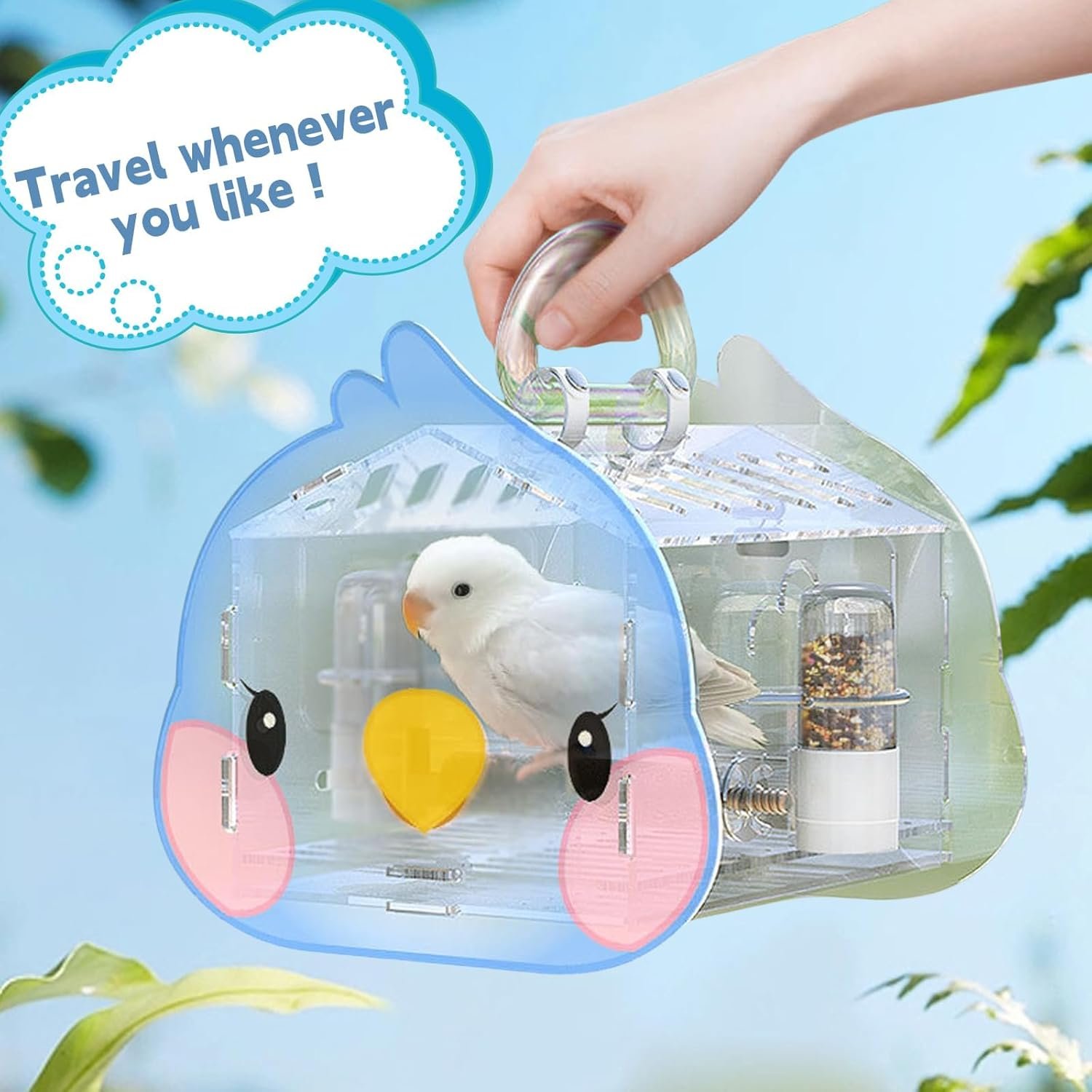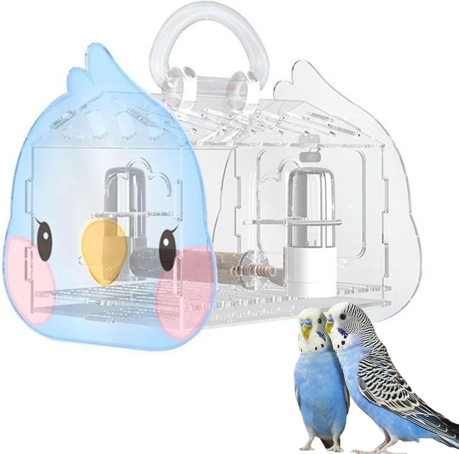 【Fashionable & Lovely Bird Carrier】Size:8.6″L x 6.5″W x 7.8″H.Very suitable for small size birds such as Budgerigar, Finch, Parakeet, Sun Conure, Lovebird.Both sides of the bird carrier cage have cute cartoon bird patterns, novel and distinctive, there are three colors to choose from, it is a fashion accessory for walking, picnics and parties with birds, catching other’s attention.