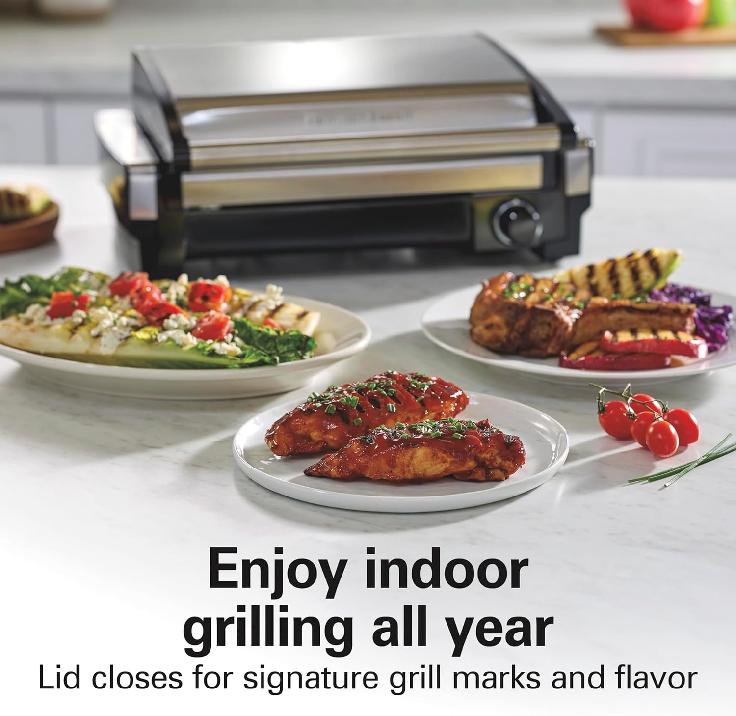 Enjoy grilling all year long: This indoor grill with hood has a high searing heat that locks in juices and flavors, and lid closes to give you signature grill marks; Serves up to 6 with 118 square inch grilling surface