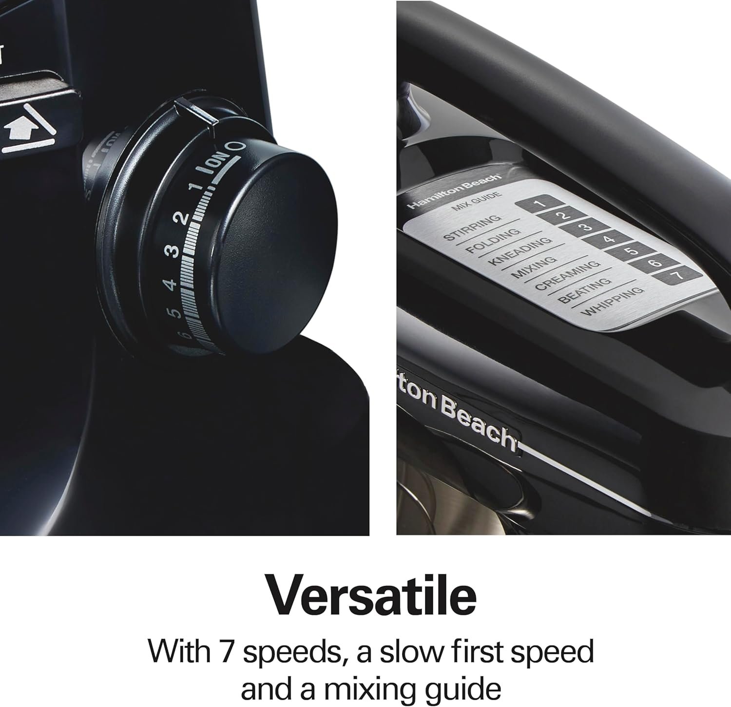 Hamilton Beach Electric Stand Mixer, 4 Quarts, Dough Hook, Flat Beater Attachments, Splash Guard 7 Speeds with Whisk, Easy-Carry Top Handle, Black