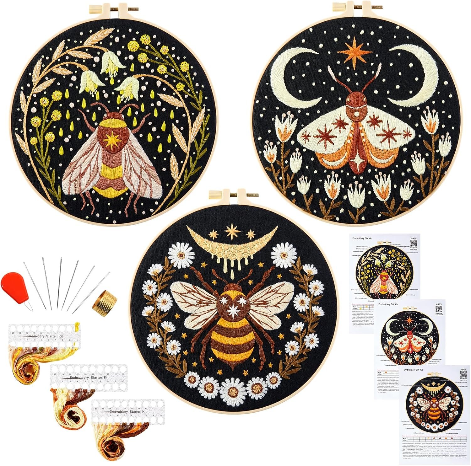 Embroidery Starter Kits for Beginners: You will get 3pcs embroidery fabric with moth moon and flowers pattern, 3pcs 8 inch embroidery hoops, 6pcs embroidery needles, enough color embroidery threads, needle threader, adjustable thimble, instructions. You can get a pretty craft decor while learning the stitch techniques by finish this adults hand embroidery kit.