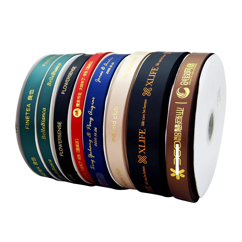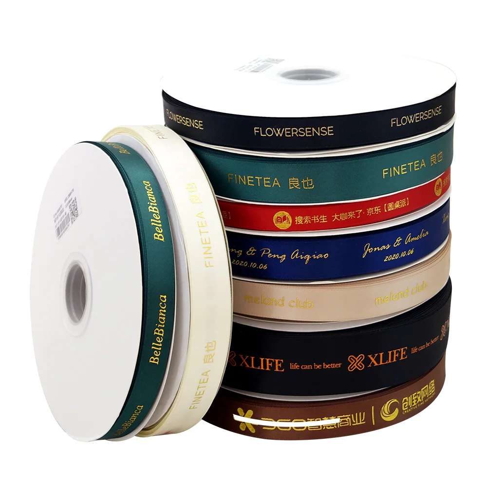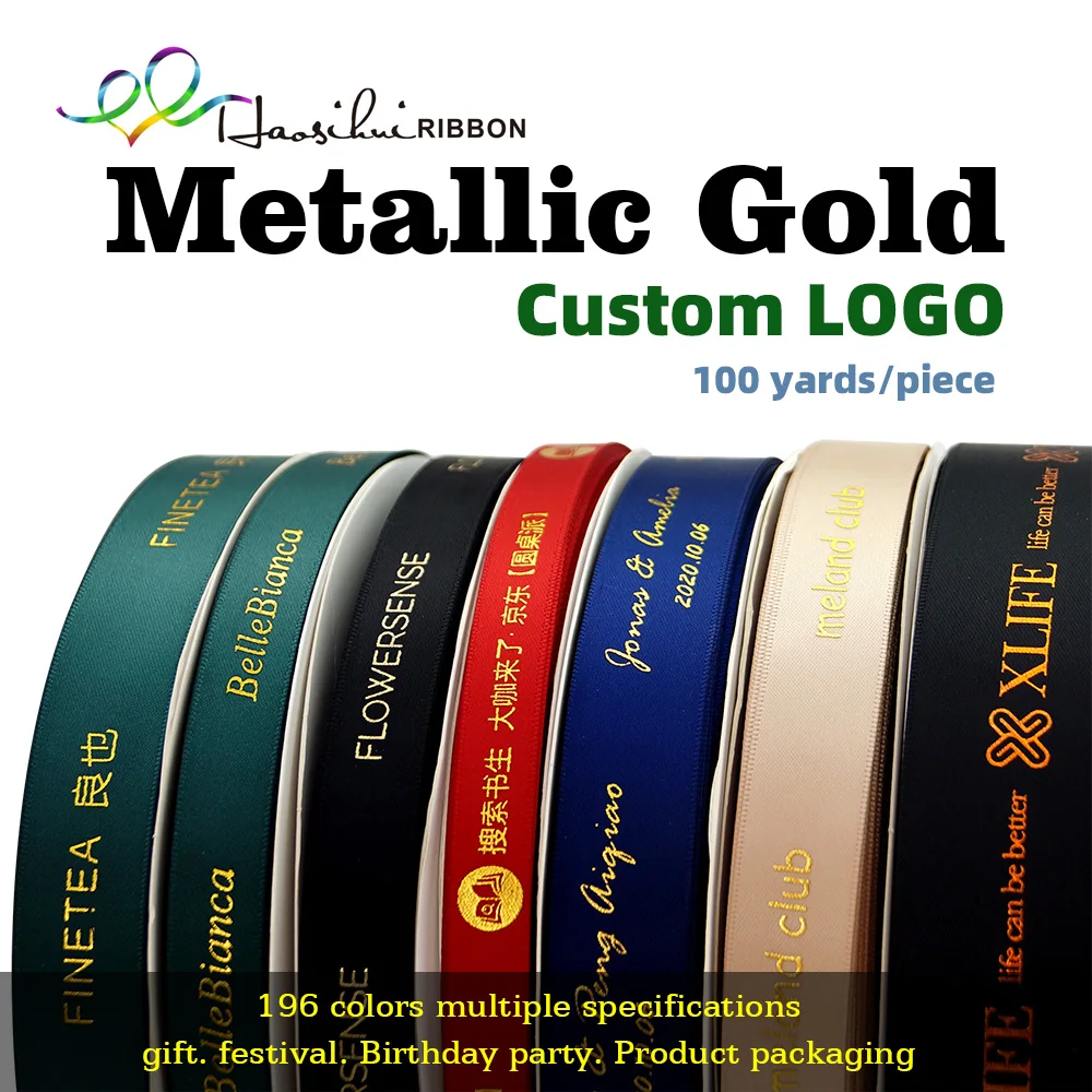 HAOSIHUI 10mm-32mm Custom Logo Hot Stamping Foil Printed Satin Polyester Ribbon for Gift Wrapping and Packaging 100 yard/lot