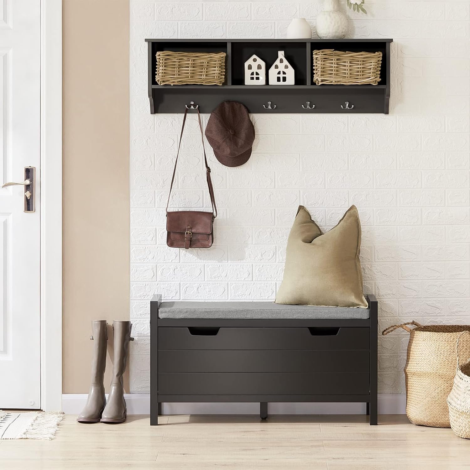 [Entryway Bench with Shoe Storage]: This black hidden shoe bench with 2 shelves shoe cabinet and removable seat cushion. Crafted for both elegance and