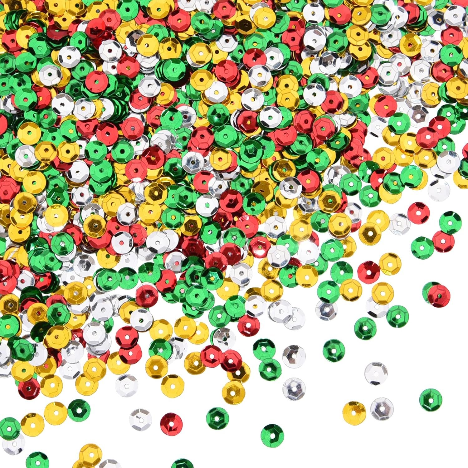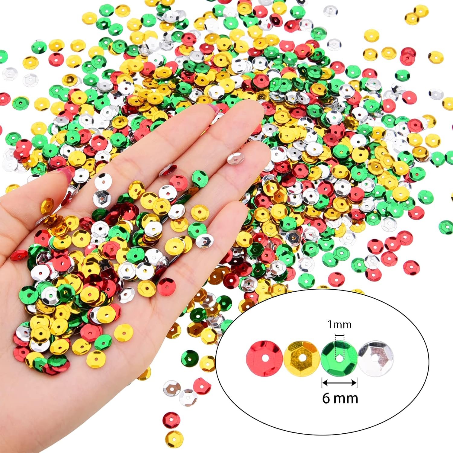 Quantity: 20000 pieces sequins, 4 colors, gold, silver, red, green, each color comes individually in a small bag for easy using and storage
