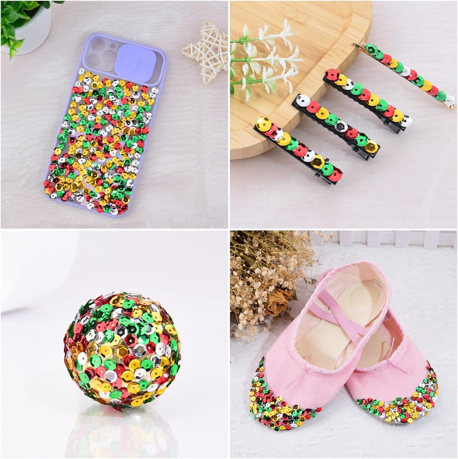 The sequins are small and shiny, attach the sequins to your favorite things, such as Christmas stocking, Christmas Ornaments, gift tags, Card, foam balls, scrapbooking, shoes, clothes, to add extra color and shine to your things.