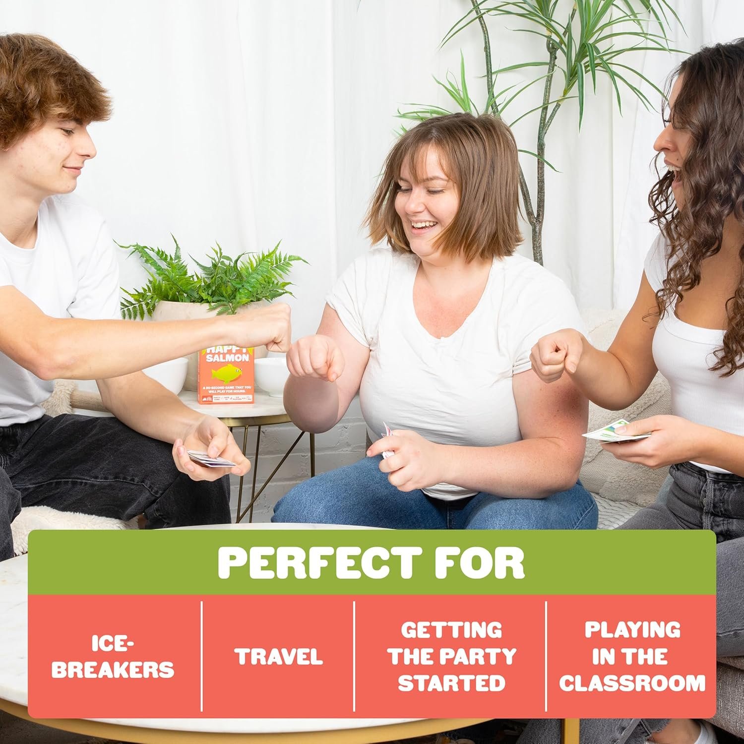 How to Play: Dive into the fun with Happy Salmon! Each player has a stack of action cards and must shout out their actions to find a match. Complete the action with a partner and discard the cards. The first to finish all their cards wins!