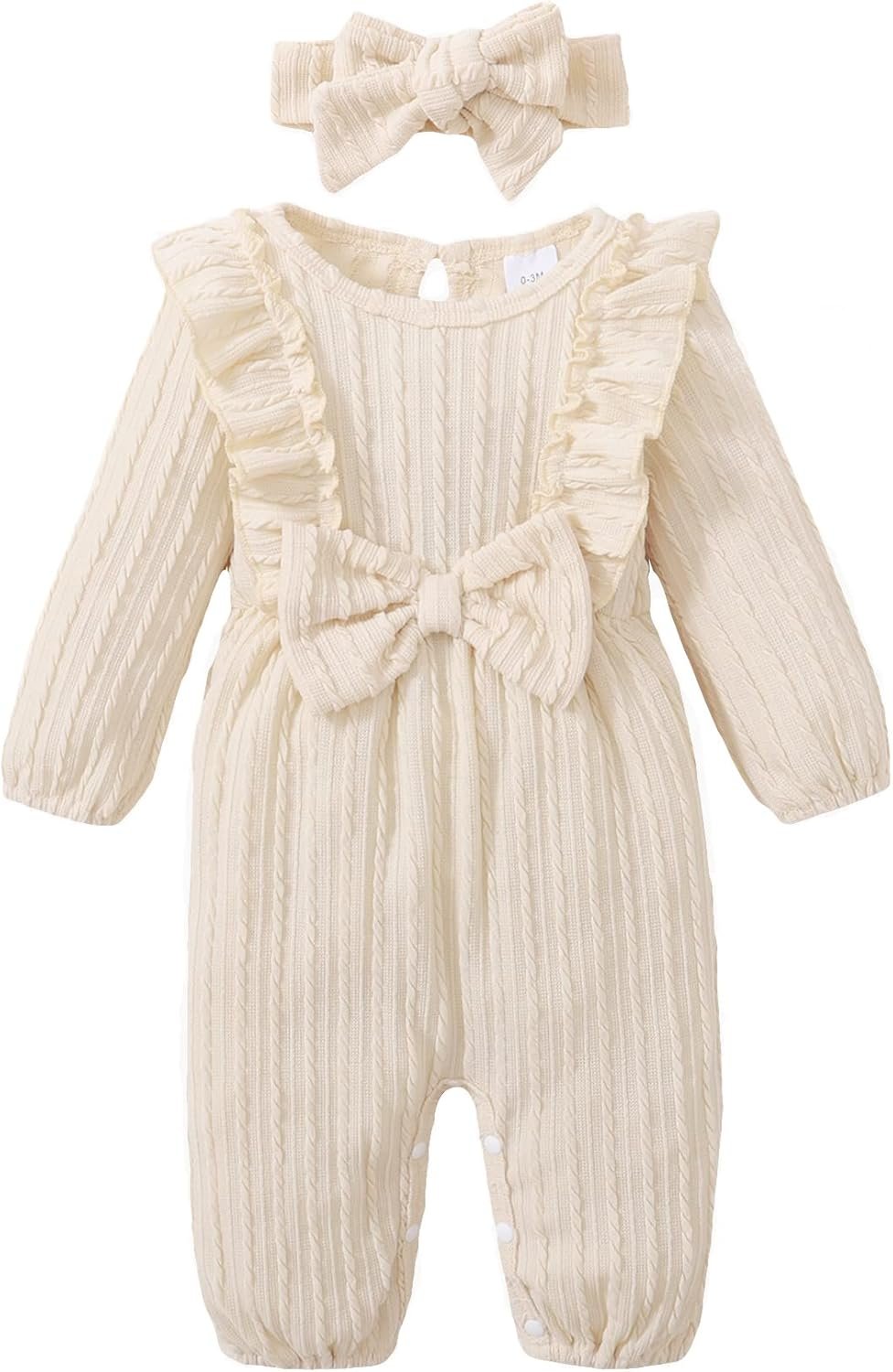 Happy Town Baby Girl Romper Infant Fall Winter Clothes Ruffle Sweater Long Sleeve Bodysuit Jumpsuit and Headband