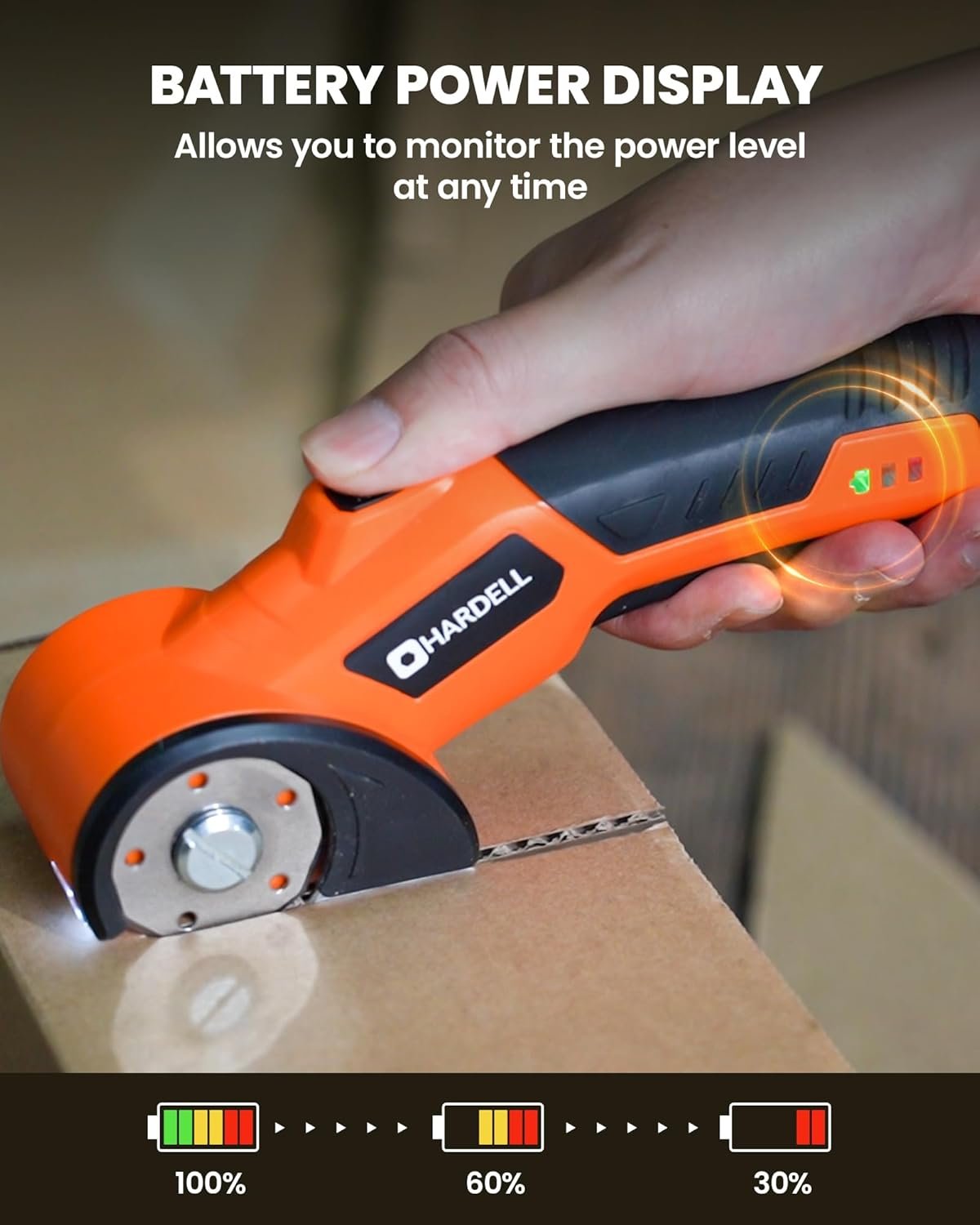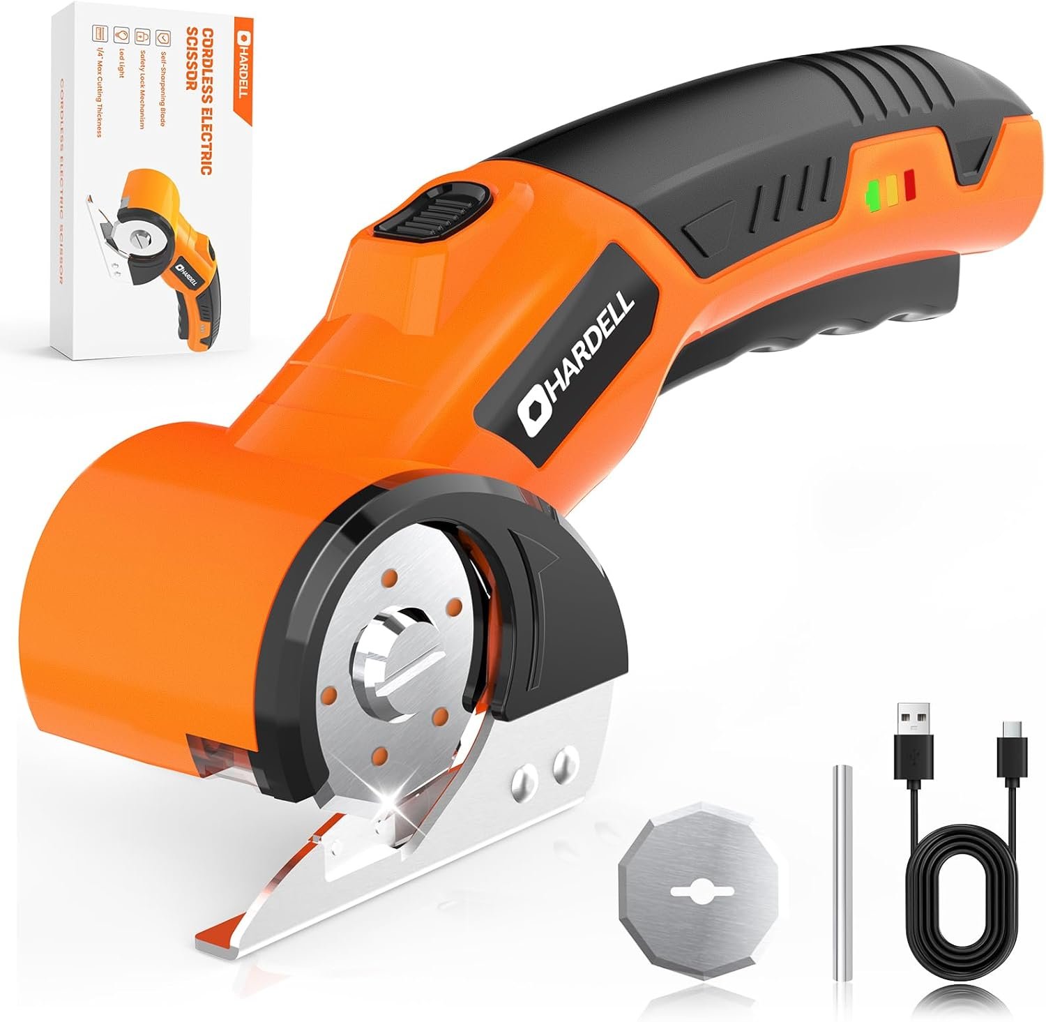HARDELL Cordless Electric Scissors, 4V Rechargeable Cardboard Cutter with 2 Blades, Max Cutting 1/4″, 320RPM Box Cutter, Safety Lock, LED Light – Suitable for Box, Plastic, Leather & DIY Projects