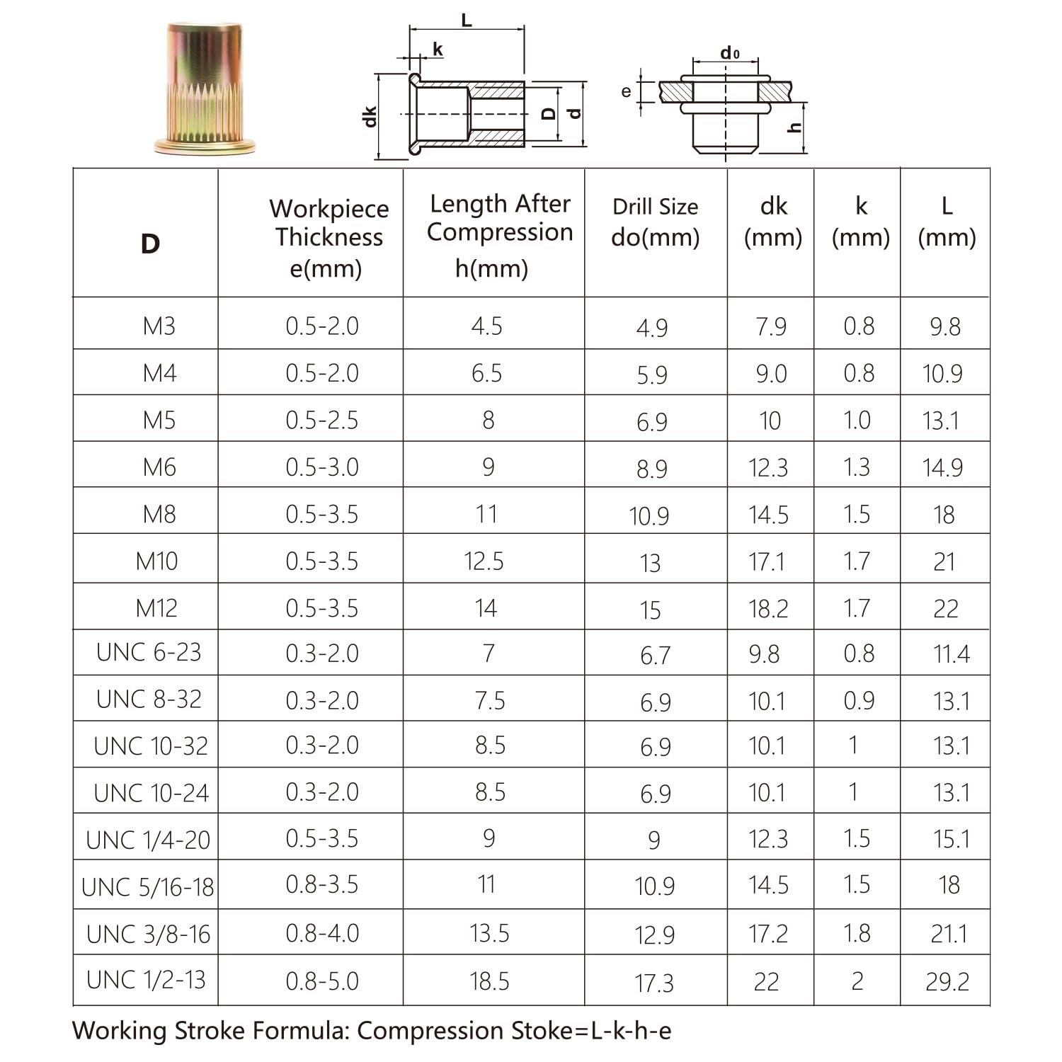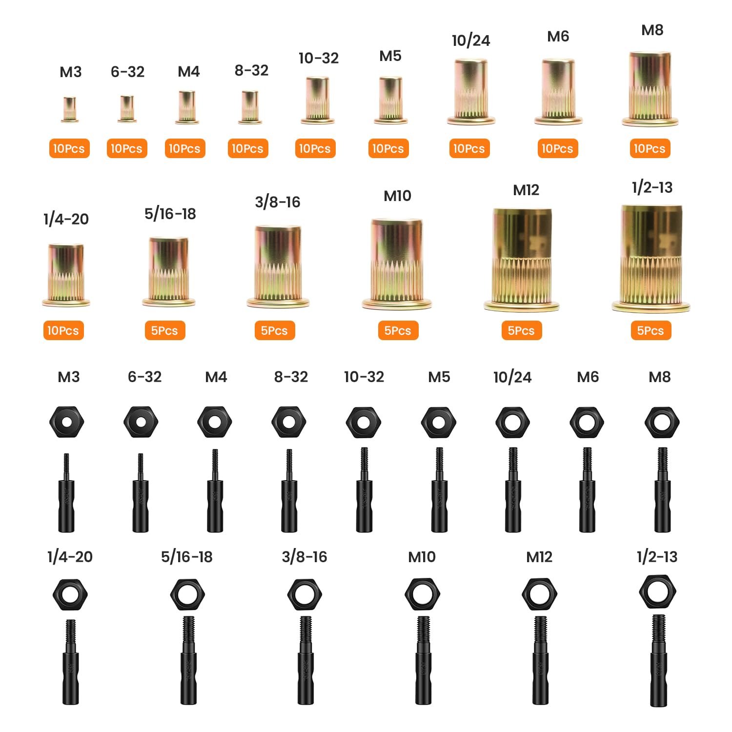 【Multiple Accessories】Our rivet nut tool kit complete with 15pcs interchangeable mandrel(Metric: M3, M4, M5, M6, M8, M10, M12; SAE: 6-32, 8-32, 10-24, 1/4-20, 5/16-18, 3/8-16, 1/2-13) and 125PCS rivet nuts. A rugged carrying case is available to keep all the rivet nut tool and accessories.