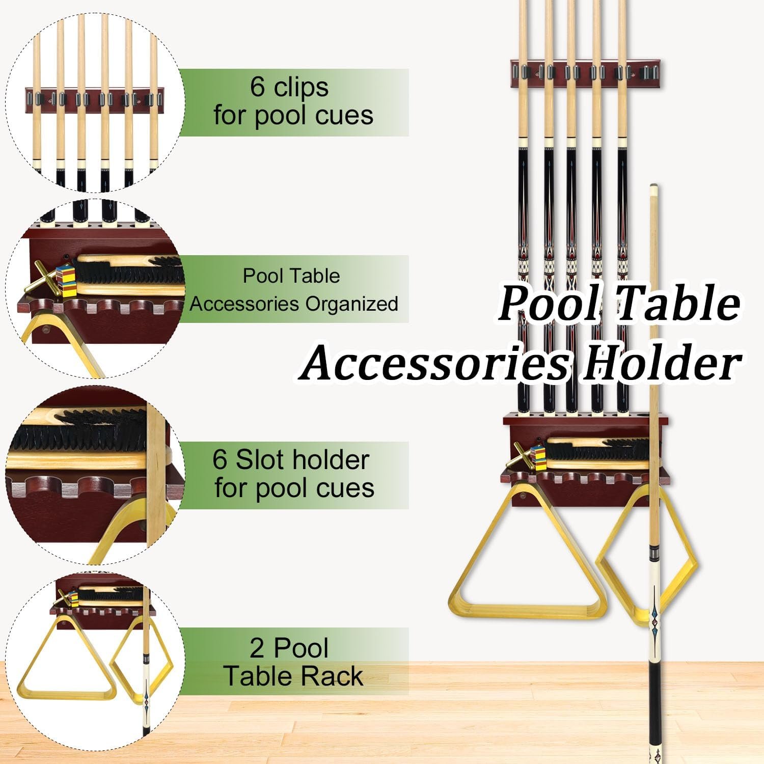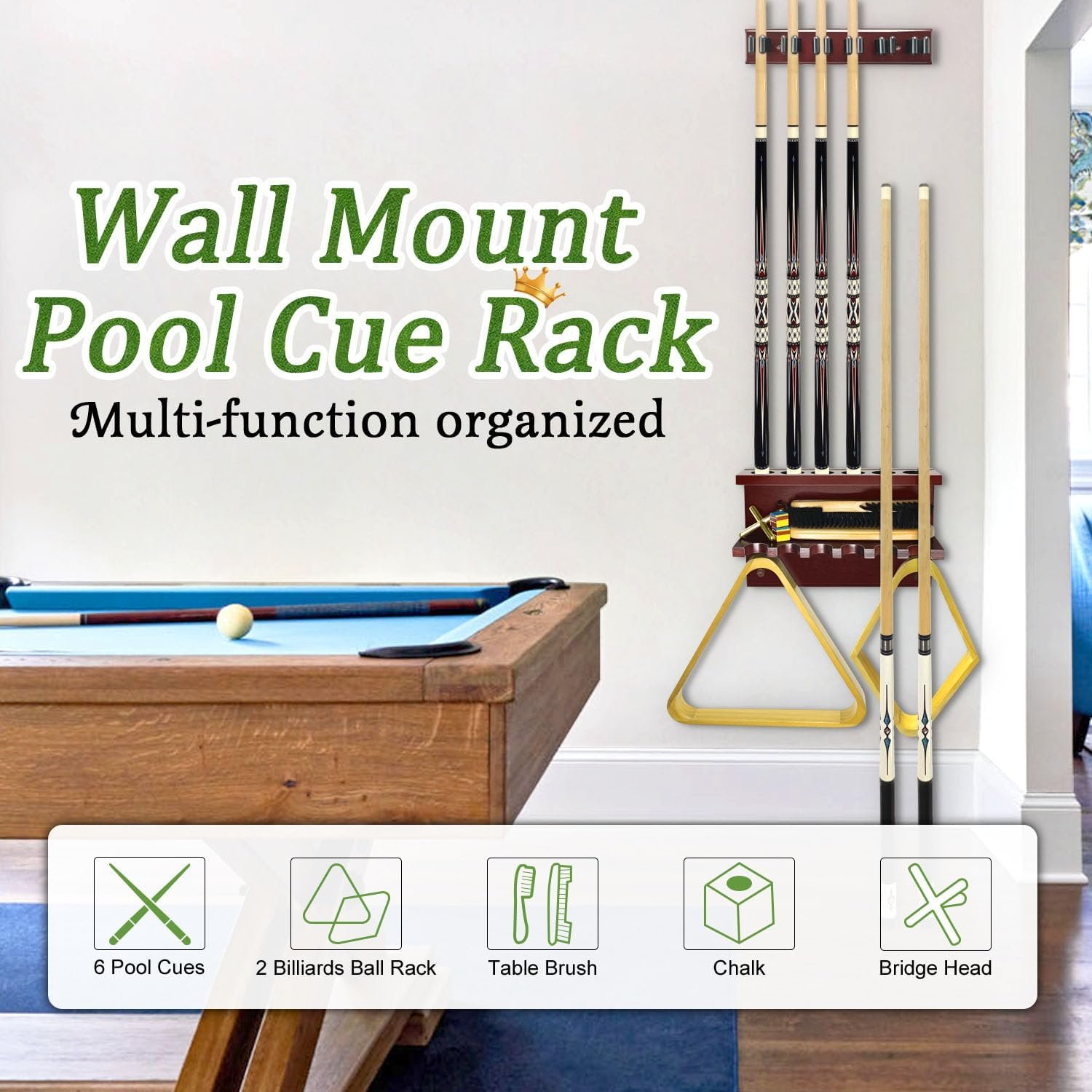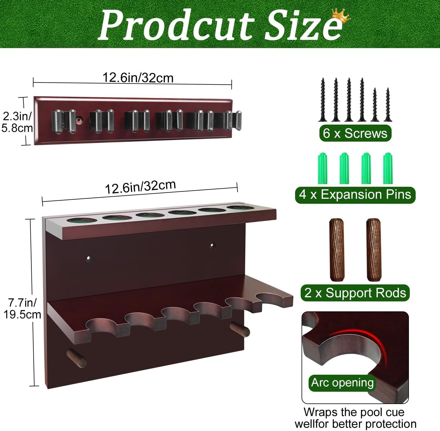 【 Premium Quality & Space-Saving】The pool cue holder made of hardwood, it is wall mount is sturdy to support all pool table accessories securely. our sleek pool cue rack maximizes space utilization, making it suitable for any room size.