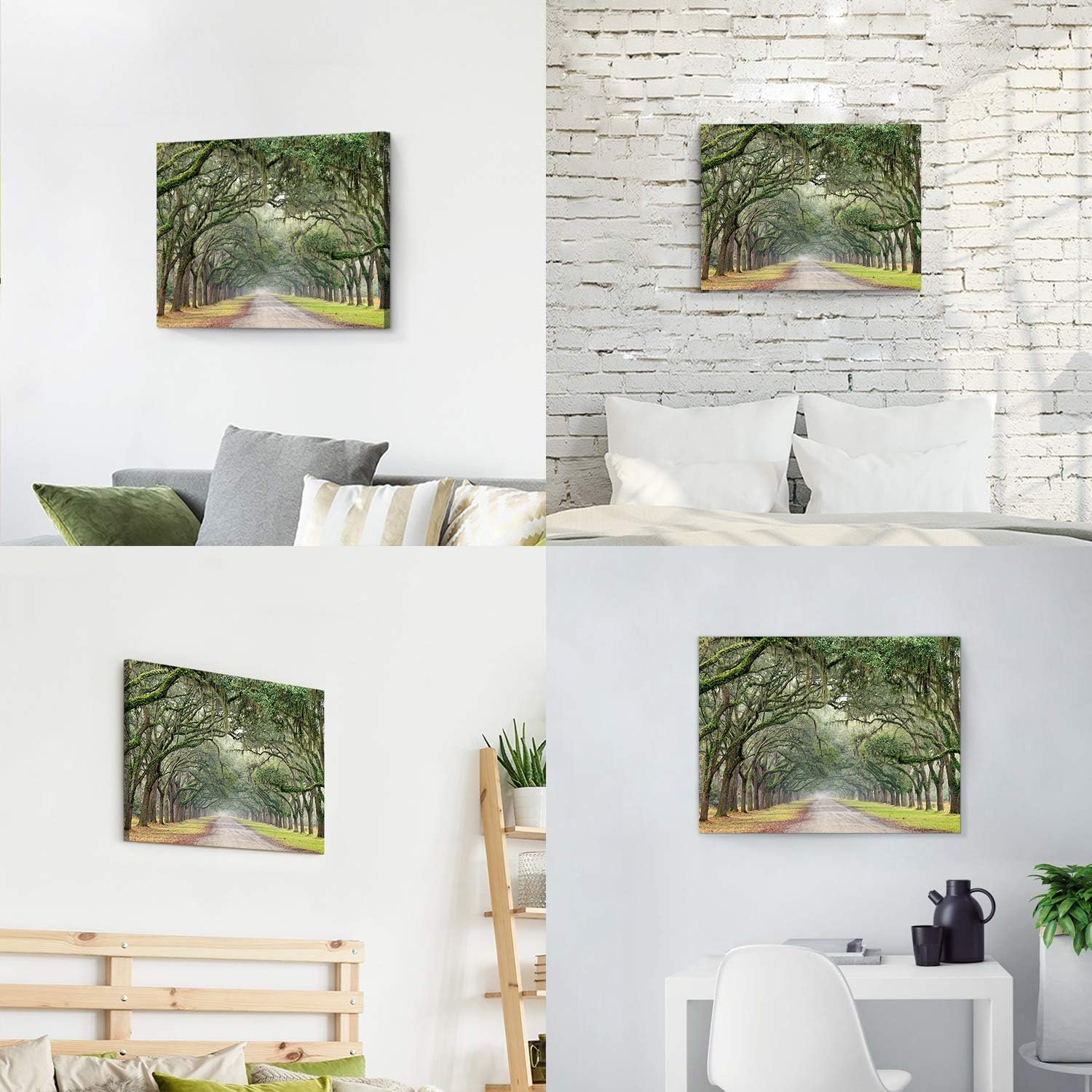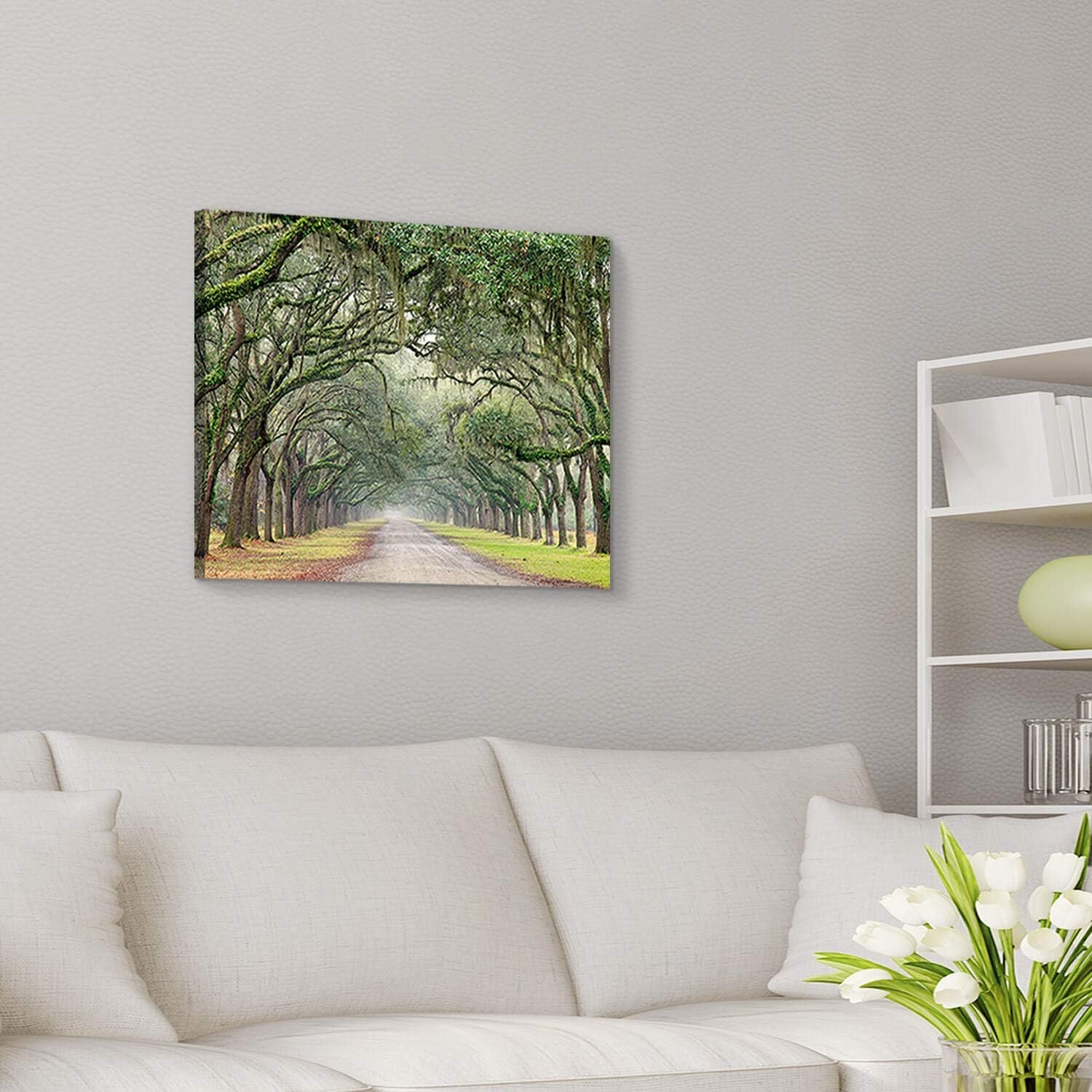 Showcases: A photographic scene of oak trees and Spanish moss-covered road, the landscape & nature wall art offers neutral hues of green and brown.