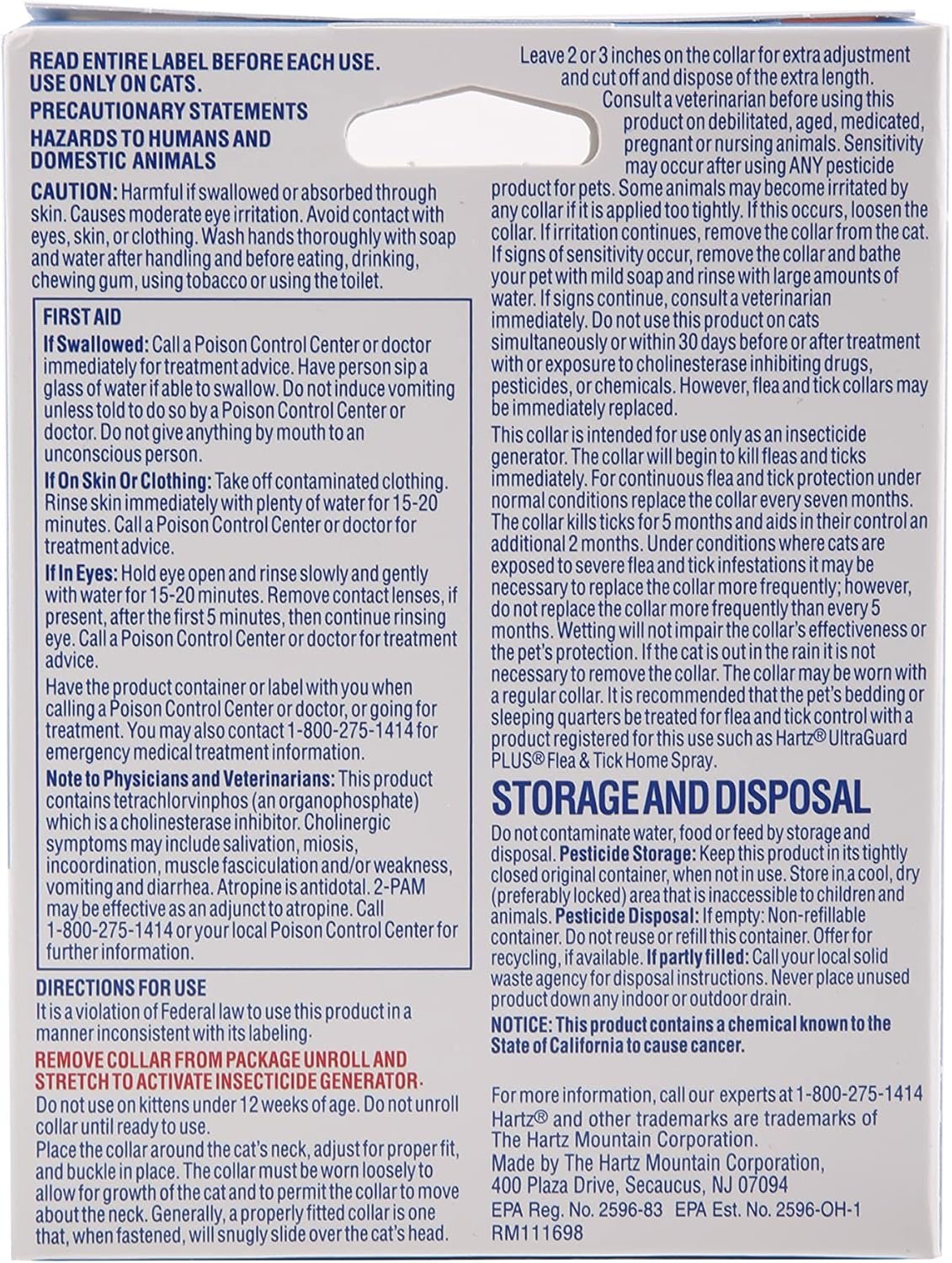 Tell pesky parasites to ‘bug off’ with the Hartz UltraGuard Flea & Tick Collar for Cats and Kittens. This fresh scented, white collar kills and repels fleas and ticks for 7 months. The water resistant design remains effective even after getting caught in the rain. Also features a breakaway safety release. For continuous flea and tick protection from head to tail, replace the collar every 7 months. Directions: Remove collar from package, unroll and stretch to activate insecticide generator. Do not use on kittens under 12 weeks of age. Do not unroll collar until ready to use. Place the collar around the cat’s neck, adjust for proper fit and buckle in place. The collar must be worn loosely to allow for growth of the cat and to permit the collar to move about the neck. Generally, a properly fitted collar is one that, when fastened, will snugly slide over the cat’s head. Leave 2 or 3 inches on the collar for extra adjustment and cut off and dispose of the extra length. Consult a veterinarian before using this product on debilitated, aged or medicated pets. Sensitivity may occur after using any pesticide product for pets. Some animals may become irritated by the collar if it is applied too tightly. If this occurs, loosen the collar. If irritation continues, remove the collar and bathe your cat with mild soap and rinse with large amount of water. If signs continue, consult a veterinarian immediately. Do not use this product on cats simultaneously or within 30 days before or after treatment of other flea and tick products. However, flea and tick collars may be replaced immediately.