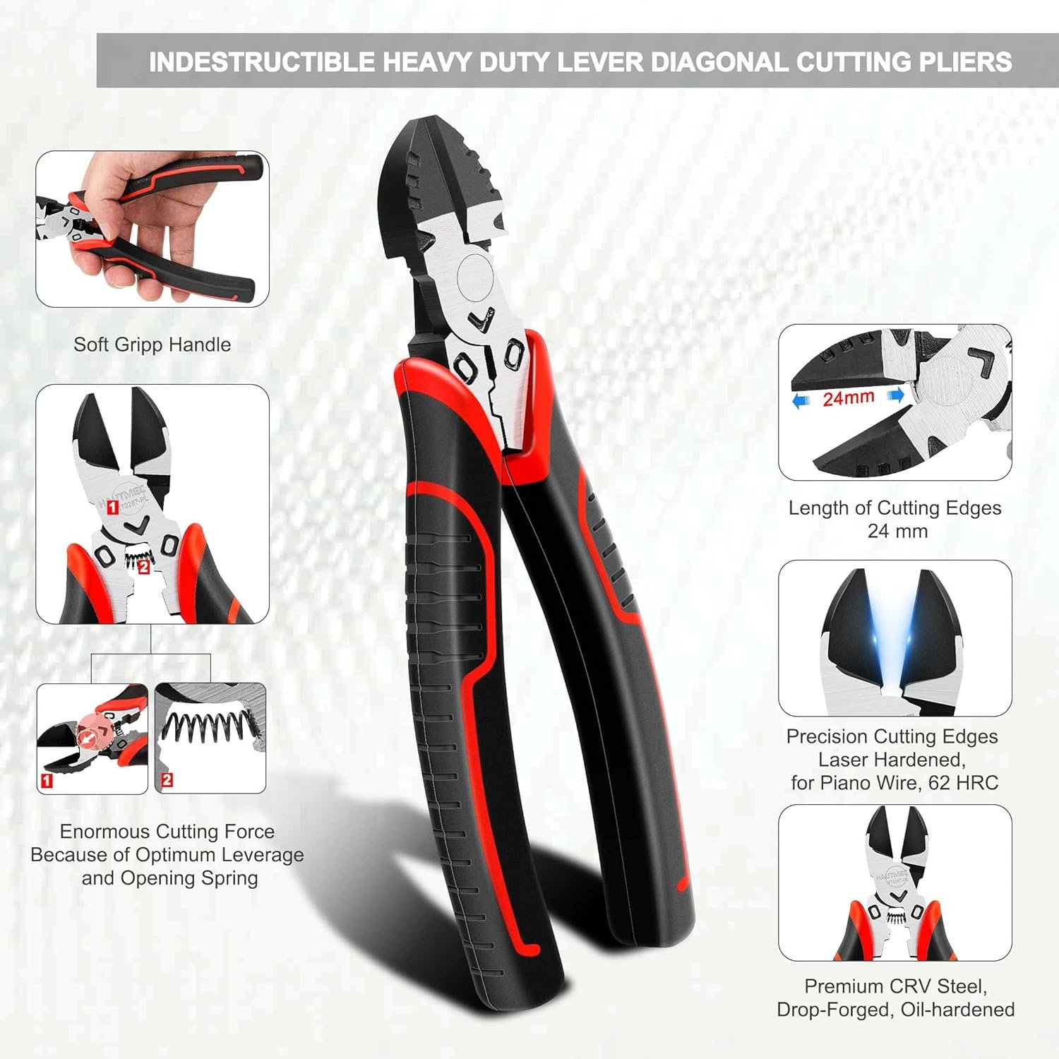 8″ Needle Nose Pliers: The long half-round and tapered jaw is distorion-tolerant, with elastic precision tips and additionally laser hardened cutting edges for cutting soft,medium-hard and hard wire; forged premium CRV steel with multi stage oil-hardened process and opening spring for easier work