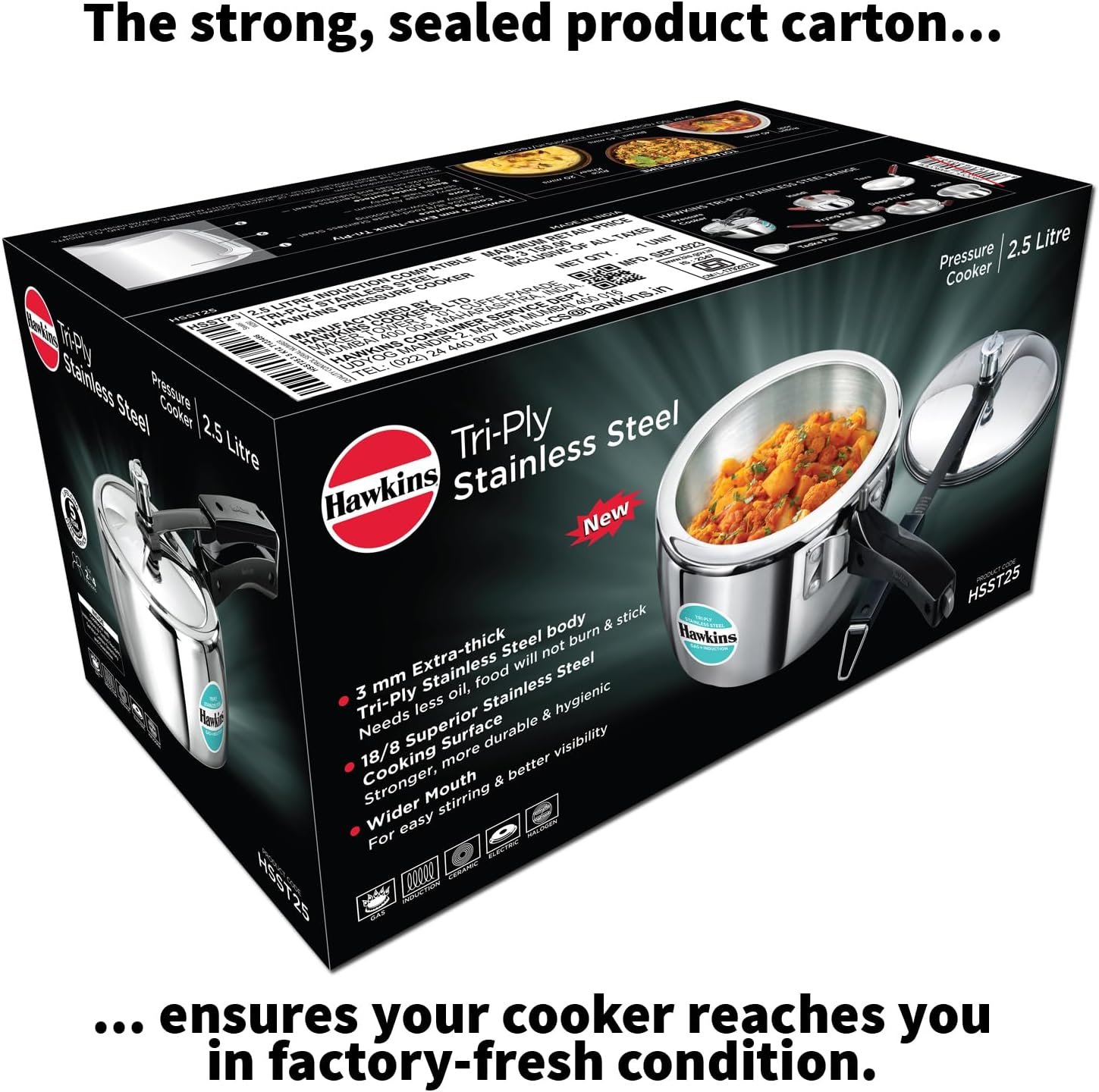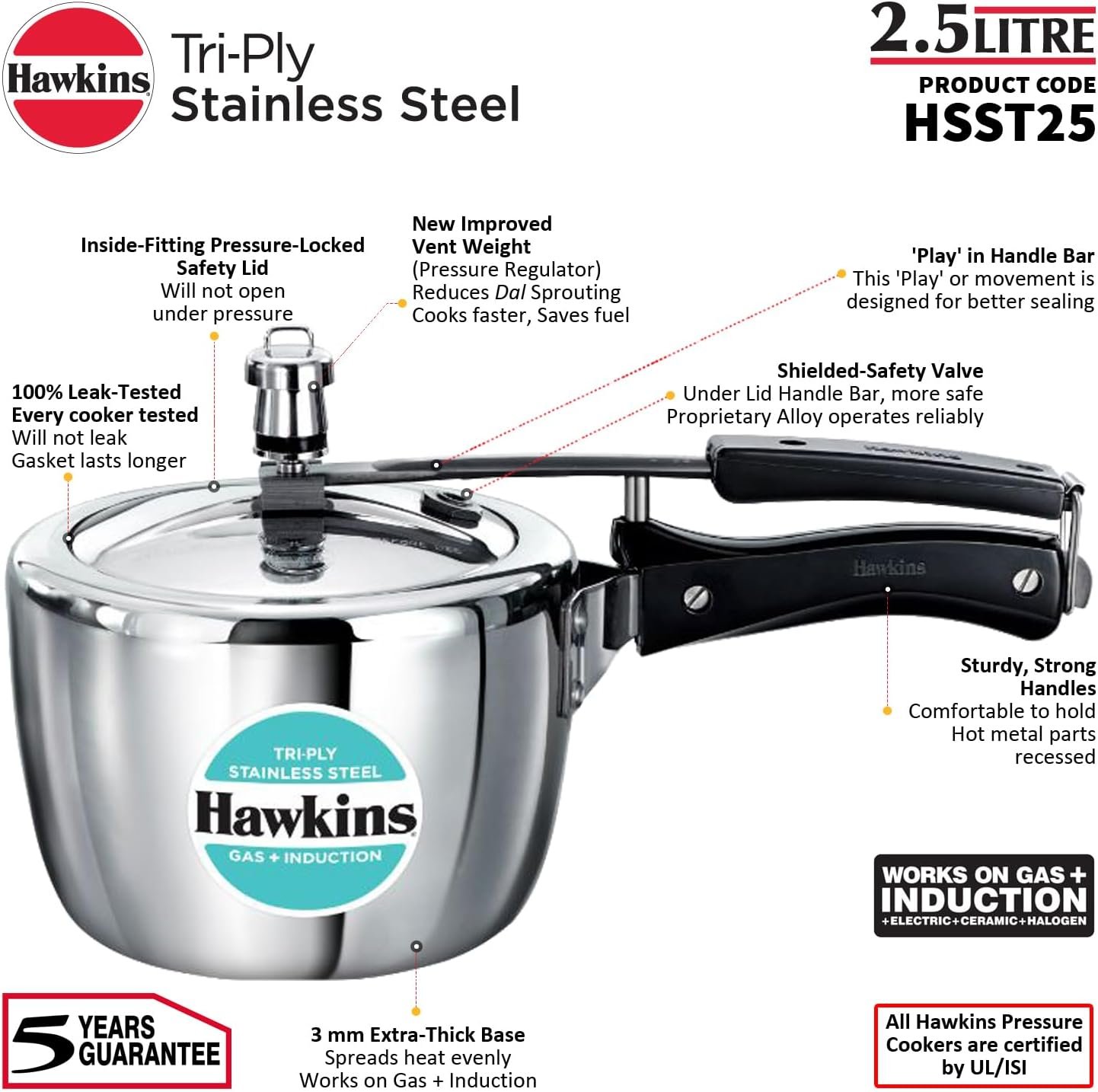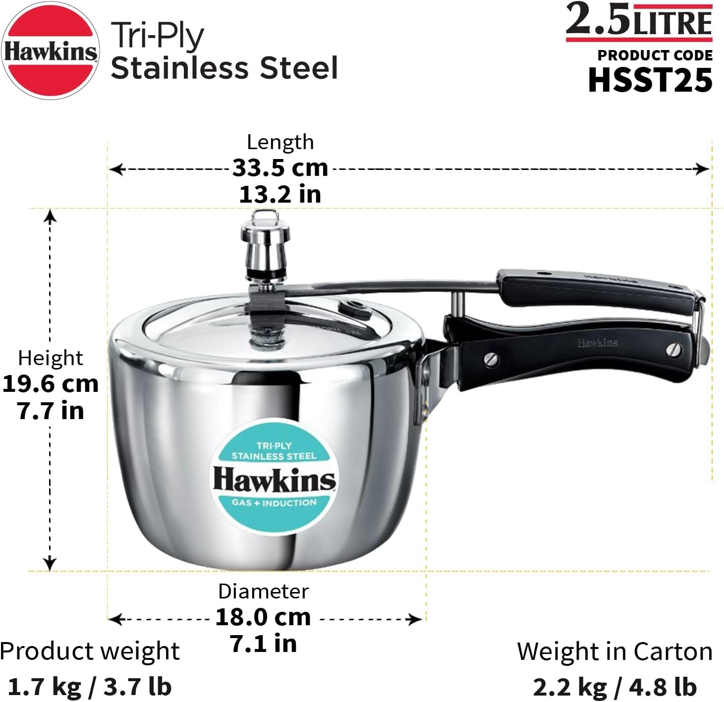 Hawkins 2.5 Litre Triply Stainless Steel Pressure Cooker, Inner Lid Cooker, Silver (HSST25)
