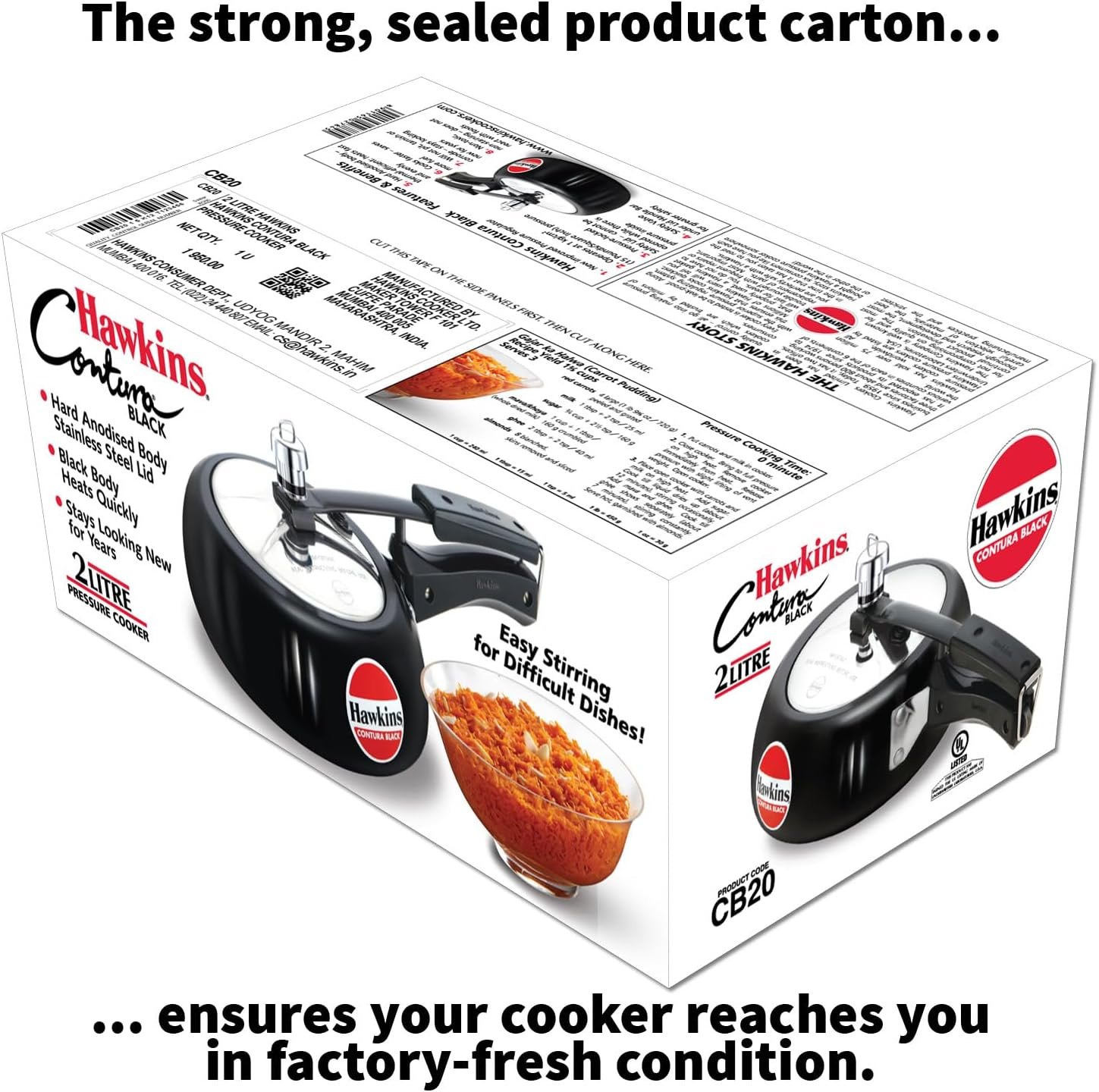 Product Description: The Hawkins Contura Black models have all the features and benefits of the Hawkins Contura Pressure Cooker in a hard anodized body and stainless steel lid. The beautiful, durable black finish given by 60 microns thick hard anodizing has two benefits. It makes the pressure cooker absorb heat faster making it more energy-efficient. And the pressure cooker stays looking new for years. Recommended for use on gas stoves. Specification: Ideal for cooking for: 2-3 Persons Base flat diameter: 134 mm Base thickness: 3. 25 mm Carton dimensions (WxDxH): 342 x 203 x 138 mm Product weight in carton: 1. 73 kg