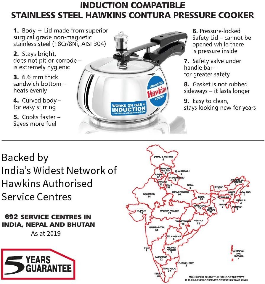 The pressure cooker is stylishly designed with a curved body to make stirring the food easy. The wide mouth of the pressure cooker offers better visibility of food. Improved Pressure Regulator.