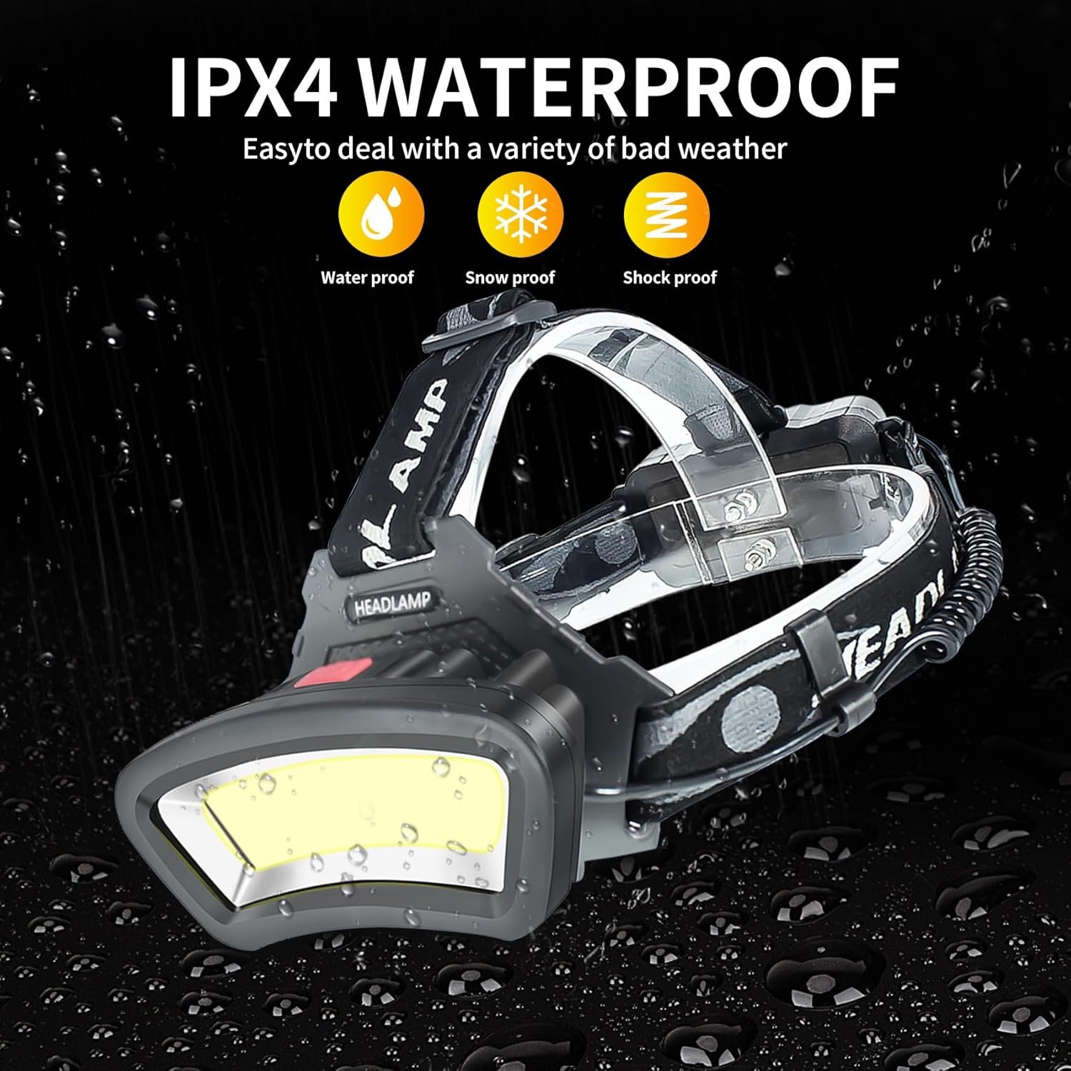 ▲Angle Adjustable & Waterproof For Outdoor Use —Practical, Reliable. The head lamp can be cracked 90° up/down and tightly fixed to avoid shaking and sliding when walking, adjust and enjoy any direction you want! Rated as IPX4 water resistant grade: On the outside, there’s a waterproof switch that’s safe to use even when it’s raining; The high-quality shell is more sealed and leak-proof, which is suitable for rain or snow, indoors or outdoors.