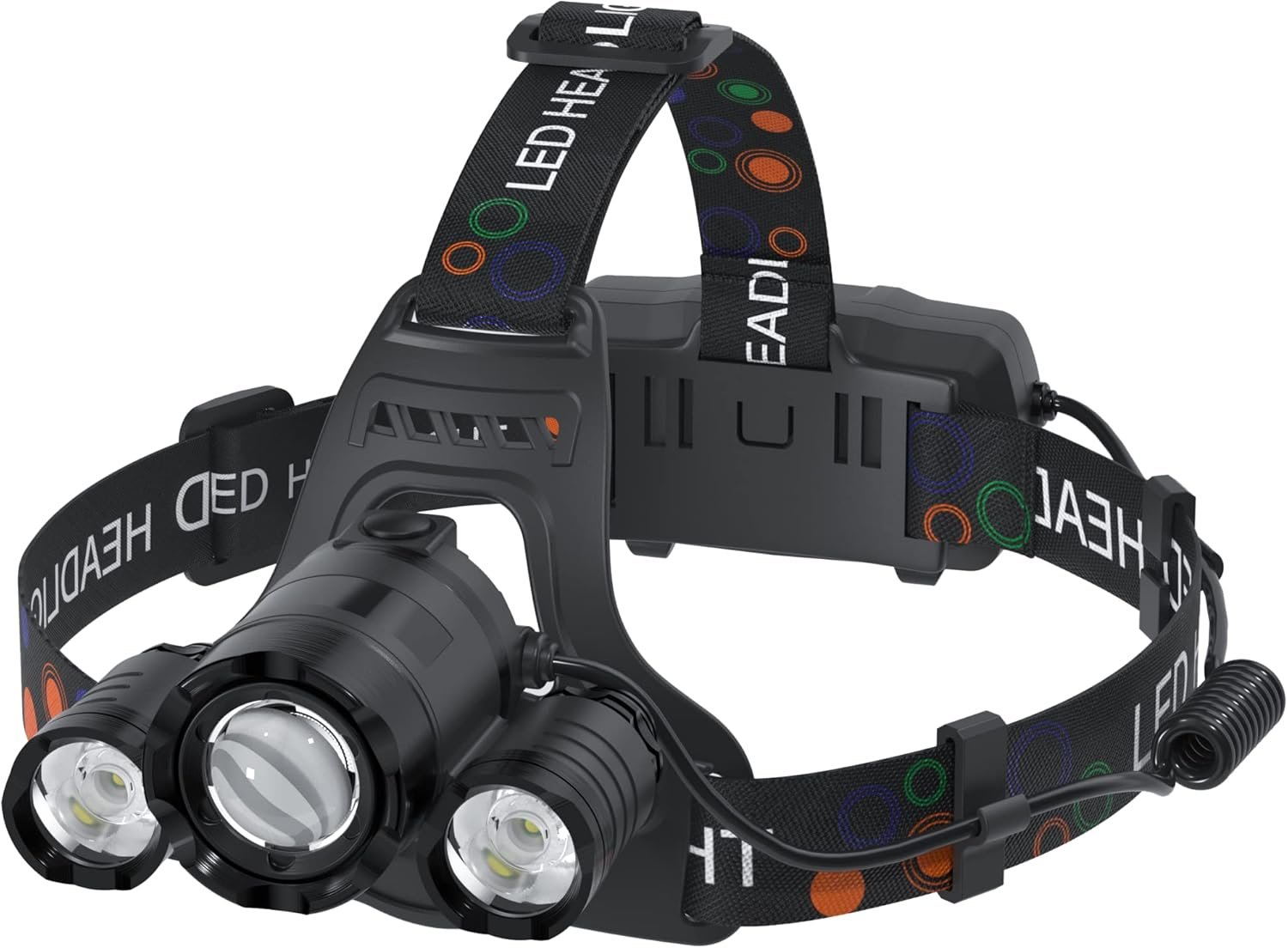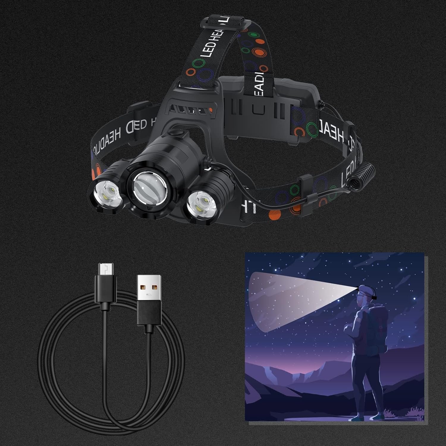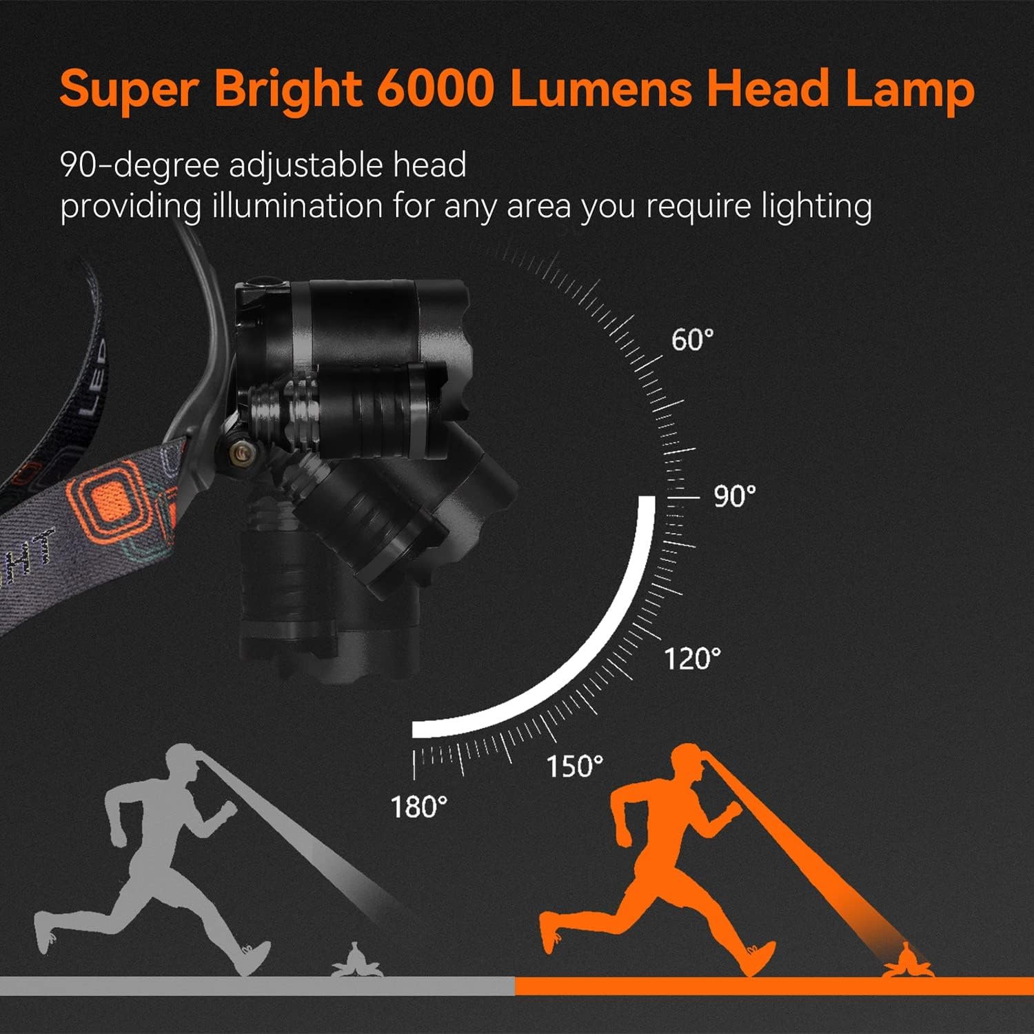 High-quality lamp beads: use 3 T6 LED lamp beads to provide 6000 lumens of illumination brightness, and the illumination distance is up to 650ft. 4 lighting modes: This Headlamp has 4 illumination modes: Main Light Mode/Two Sidelights Mode/All Light Mode/Emergency Strobe Light.