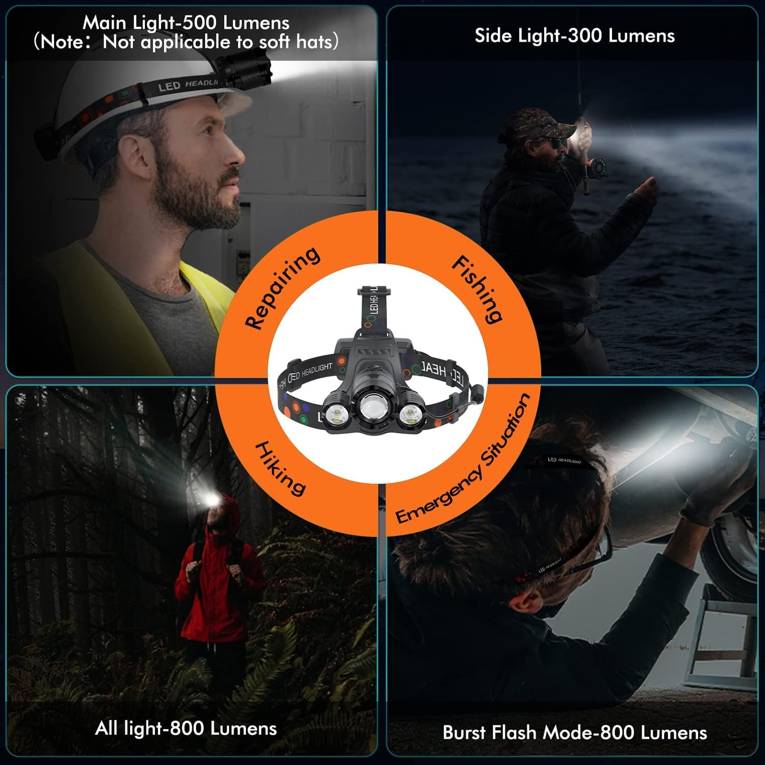 4 Lighting Modes Head lamp with Large Capacity Rechargeable Battery – This headlamp has 4 lighting modes: main light, side light, full light, and emergency strobe. Designed with USB, it comes with two 1200mAh rechargeable batteries that can last for 6-8 hours after being fully charged. It is suitable for various outdoor activities such as car maintenance, camping, cave exploration, jogging, night walking, hiking, fishing, exploring, and night reading.