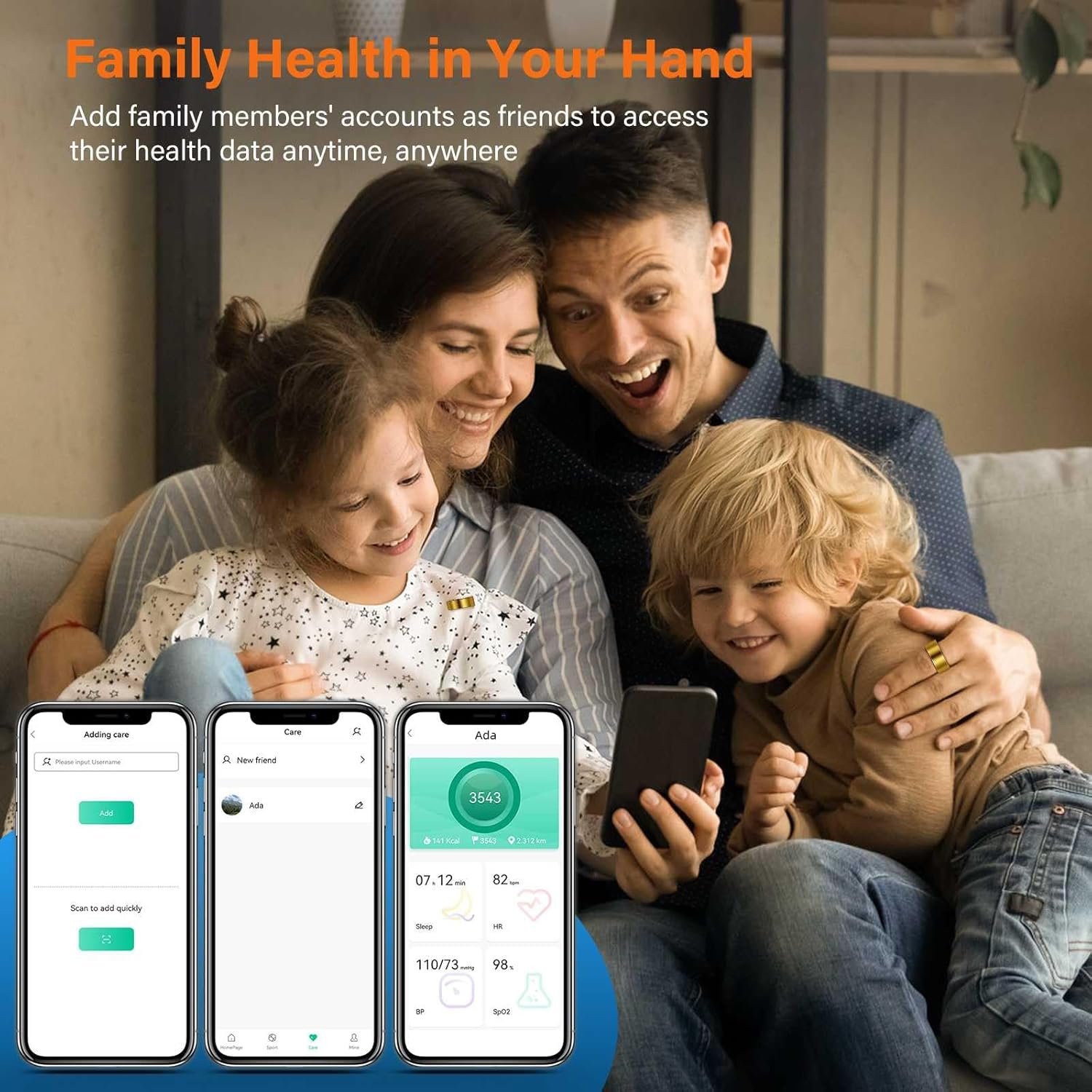 【Care for Your Loved Ones】The health rings for women can Keep track of your family’s health data with ease using the dedicated app. You can add family members, monitor their heart rate, blood pressure, steps, and sleep patterns, and provide them with support whenever needed. Stay close and connected with your loved ones by monitoring their well-being in real-time