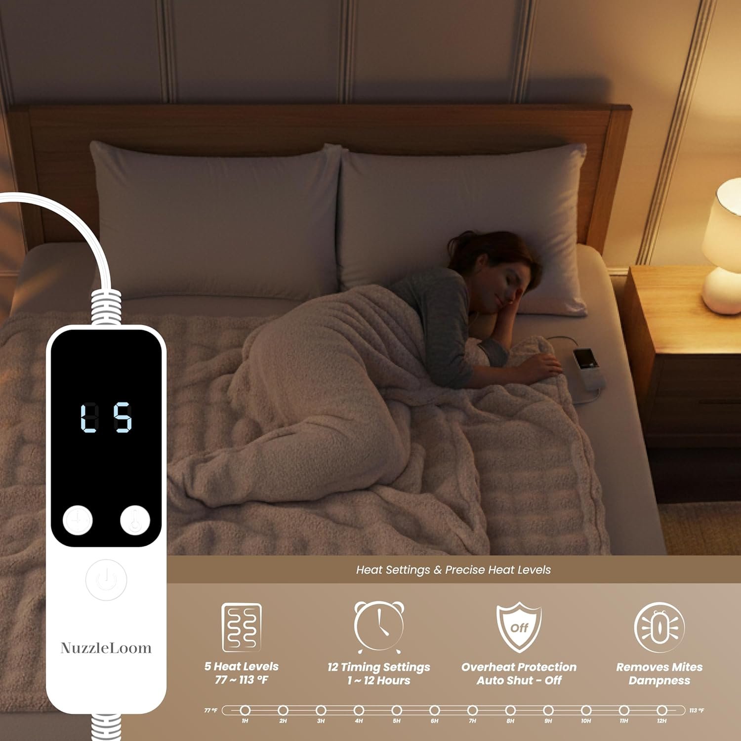5 Heat Settings & Auto Shut-Off Timer: Customize your comfort with 5 precise heat levels (77–113°F). The convenient 5 hour auto-shutoff timer provides personalized warmth for sleeping or lounging while saving energy. Find your perfect cozy setting with ease.