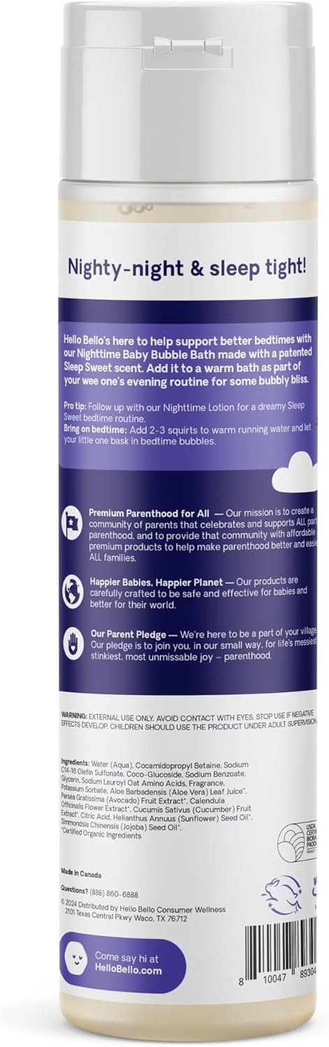 Hello Bello Sleep Sweet Scented Baby Bubble Bath is Dermatologist Tested, Kind to Skin, Not Tested on Animals (Leaping Bunny Certified), USDA Biobased 94% and designed with babies, budgets, and the planet in mind