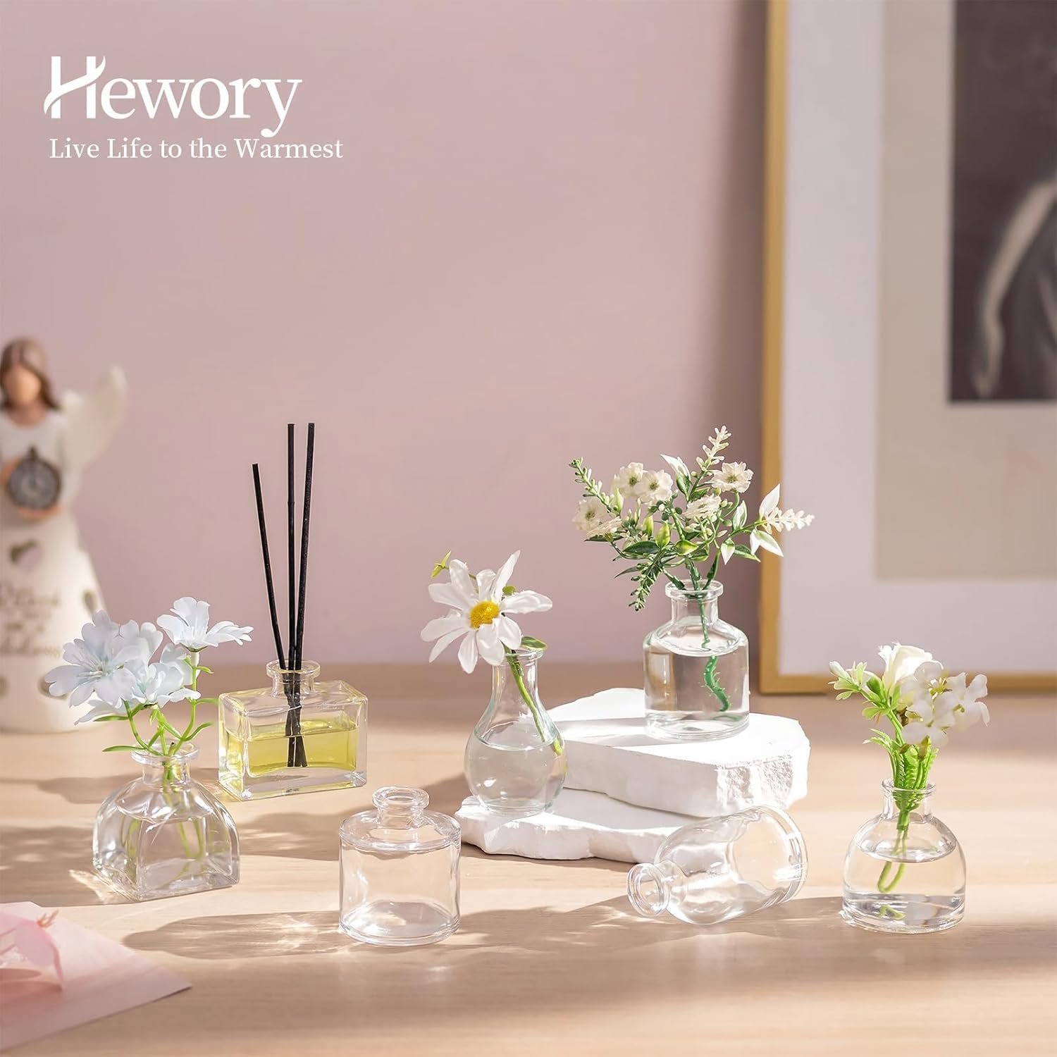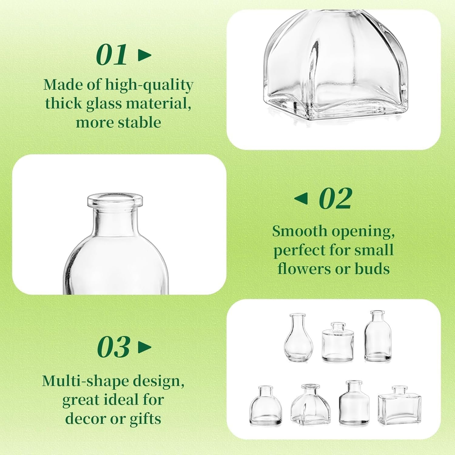 Versatile Small Glass Vase: The glass bud vases are designed with a modern look, blending well with any decor style. They are more than glass vases for flowers, but pretty reed diffuser bottles, plant propagation vases, and also party favors for the guests on Anniversaries, birthday, Housewarming, Thanksgiving!