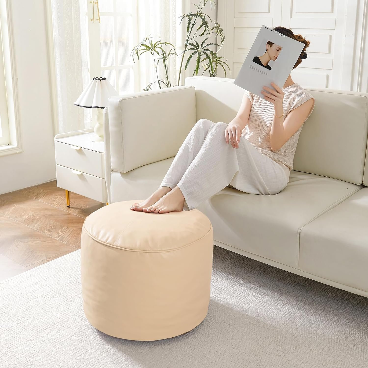 HIGOGOGO Round Stuffed Pouf Ottoman, Pu Leather Poufs with Foam Chunk Filling, Furry and Fluffy Pouf Foot Stool Storage Ottoman, 20 X 15 Floor Poufs Foot Rest for Living Room, Beige
