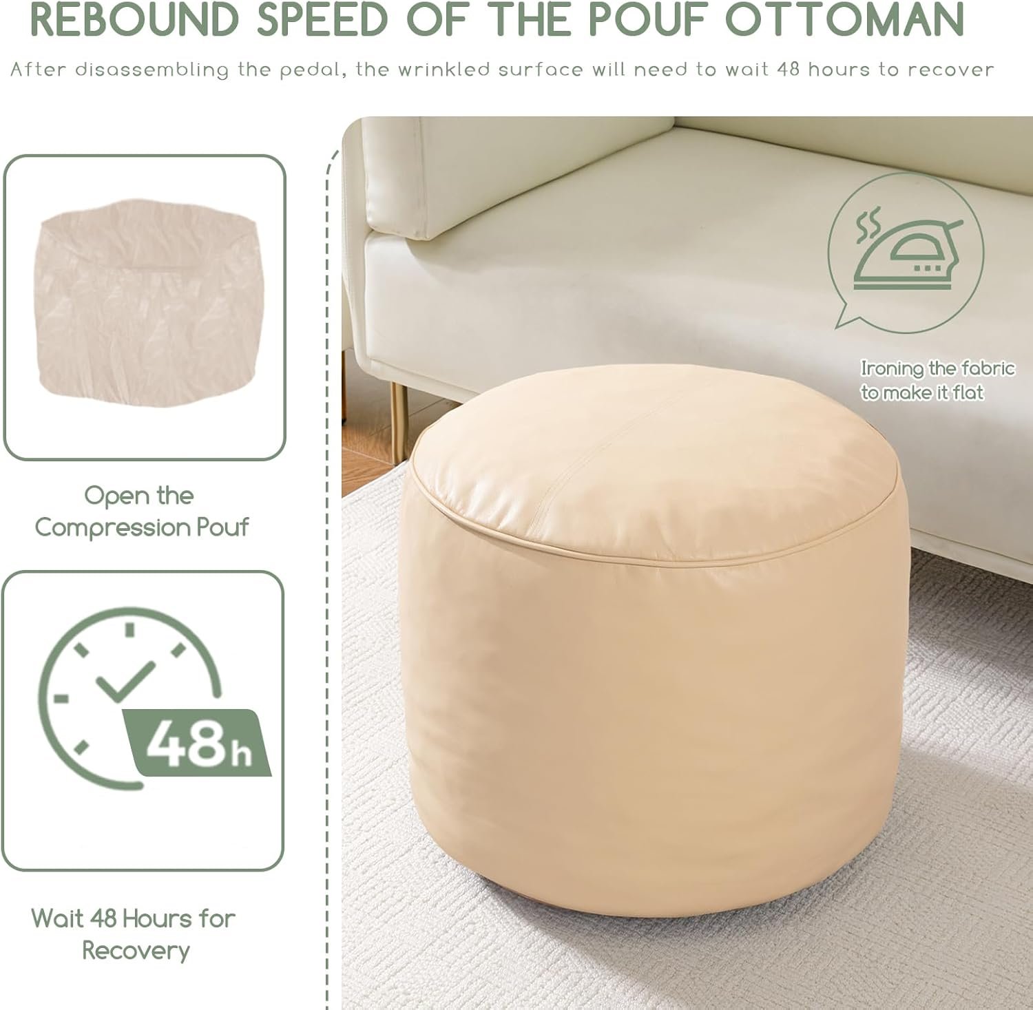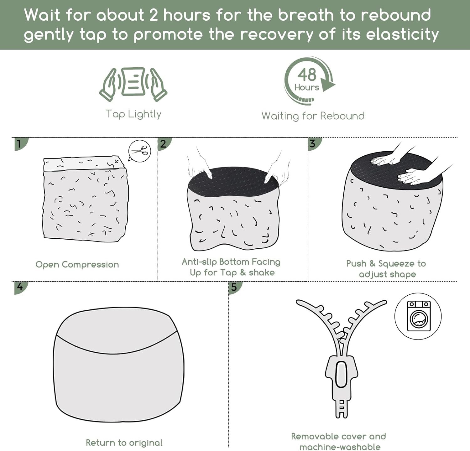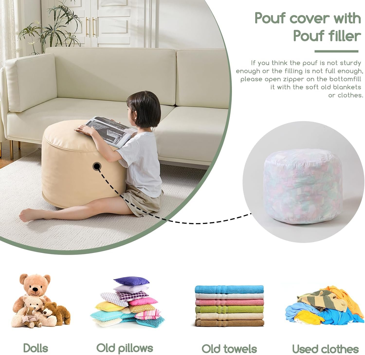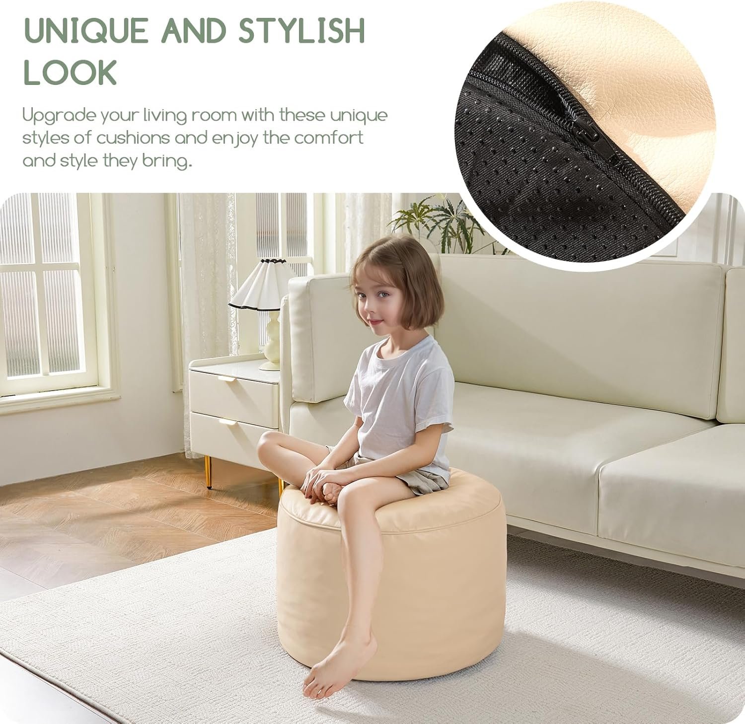 For convenience and ease of use, this pouf ottoman comes pre-filled with memory foam chunk pouf filler, which can be easily inserted through the large round opening on the bottom with double zippers