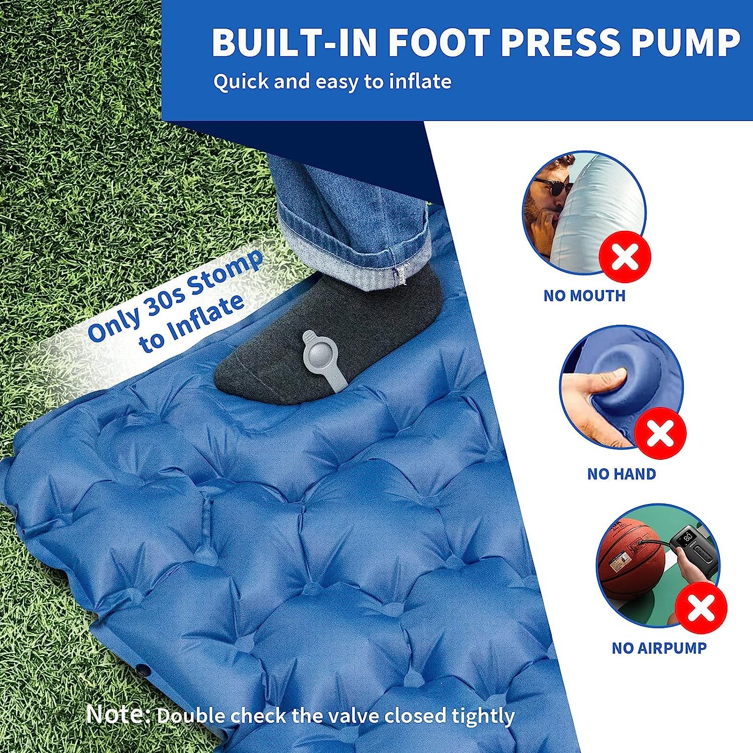 ⛺【Foot Type / Only 30s Stomp to Inflate & 1s Deflate】 This camping sleeping pad does not require you to purchase a pump or air filler alone. The foot part is equipped with a foot type air pump. Unlike conventional air filling methods such as electric air pump, manual air pump, and spray, it will be fully charged with a foot by pressing the air pump to complete the air. Women, children and the elderly are easy to complete and can be easily completed in minutes even with exhaust gases.