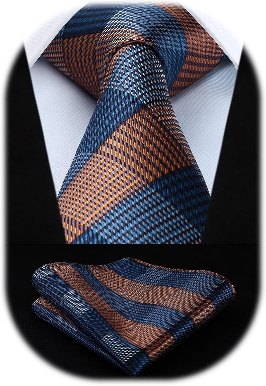 Necktie: 3.4 ” × 59 ” (8.5cm × 150cm);Handkerchief : 12” x 12 ” (31cm x 31cm);Silk Blend + Polyster , 1 Tie & 1 Pocket Square(with Gift Box).
