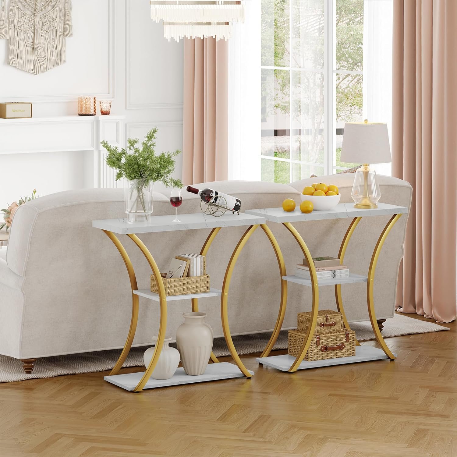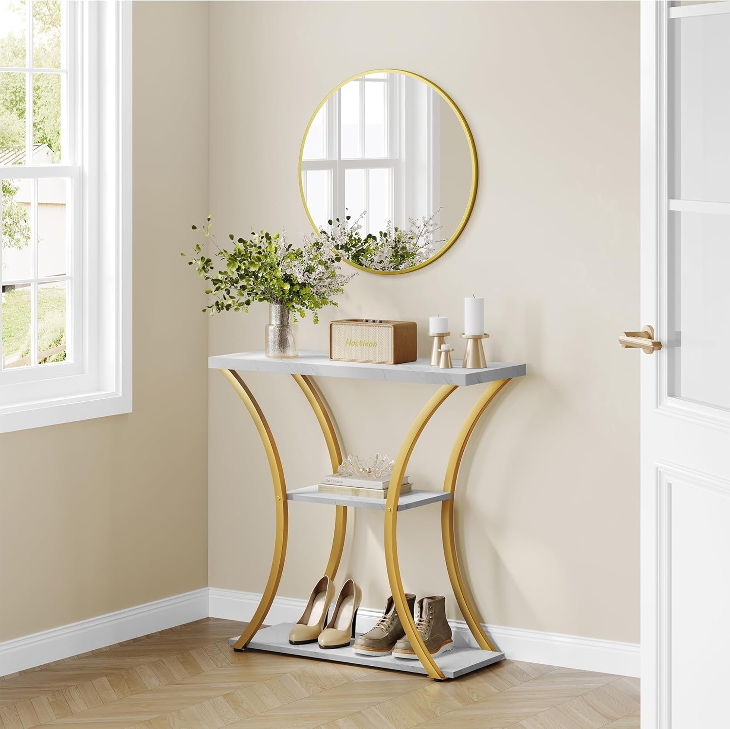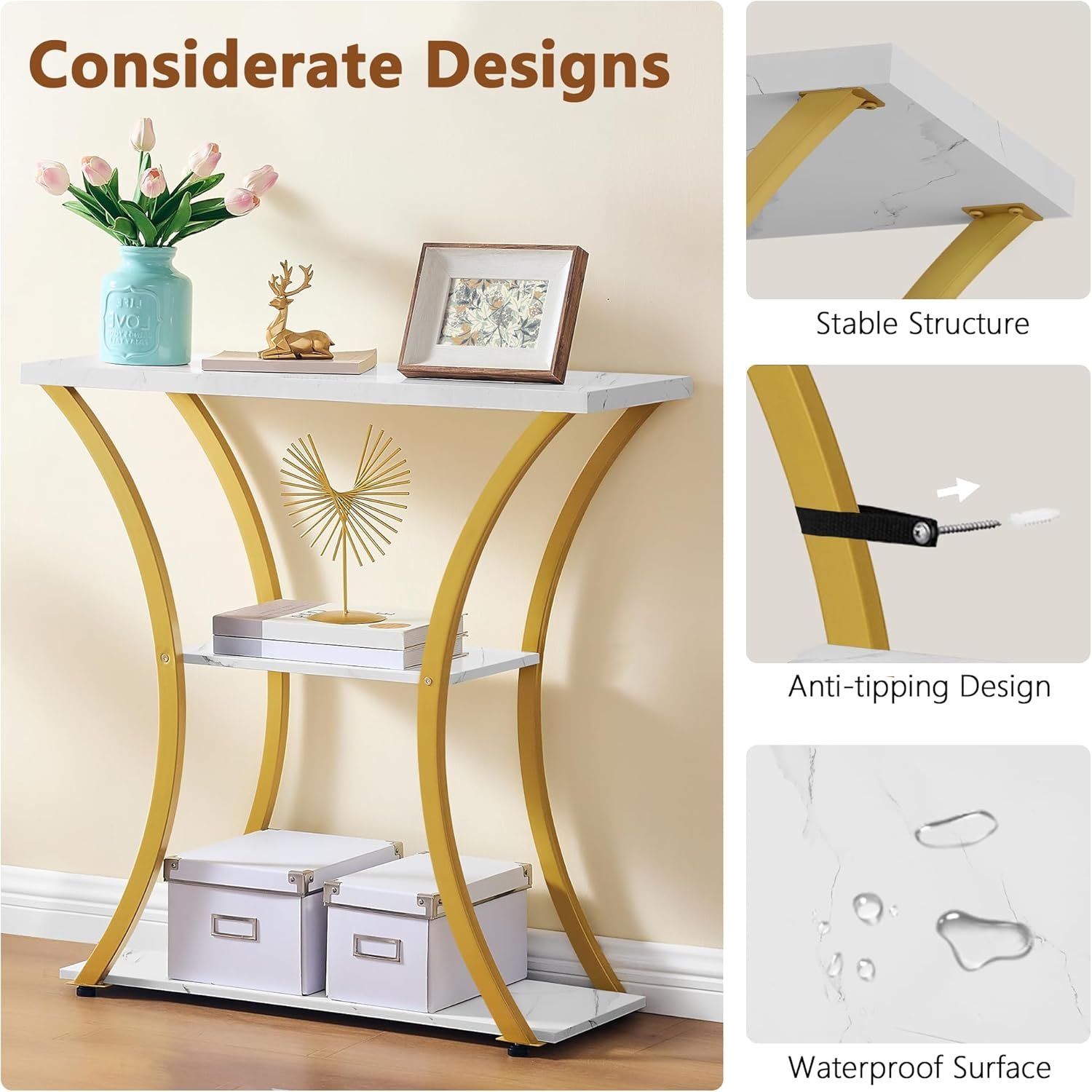 Hoctieon 3 Tier Console Table with Open Wood Shelves, Decorative Entryway Table with Curved Metal Frames, Narrow Sofa Table for Entrance, Living Room, Hallway, Gold and White Marbled
