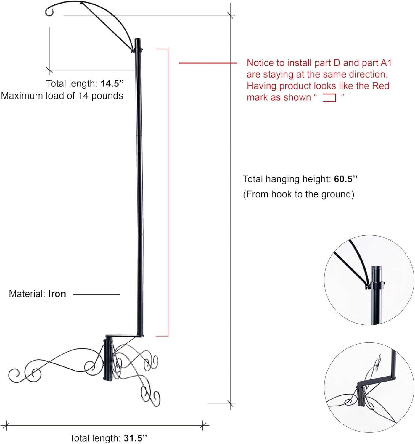 HOHIYA 61 Inch Bird Cage Stand Shepherd Hook Hanging for Hummingbird Feeder Solar Light Lantern Plant Basket Max Loading14 Lbs Black Taiwan Made