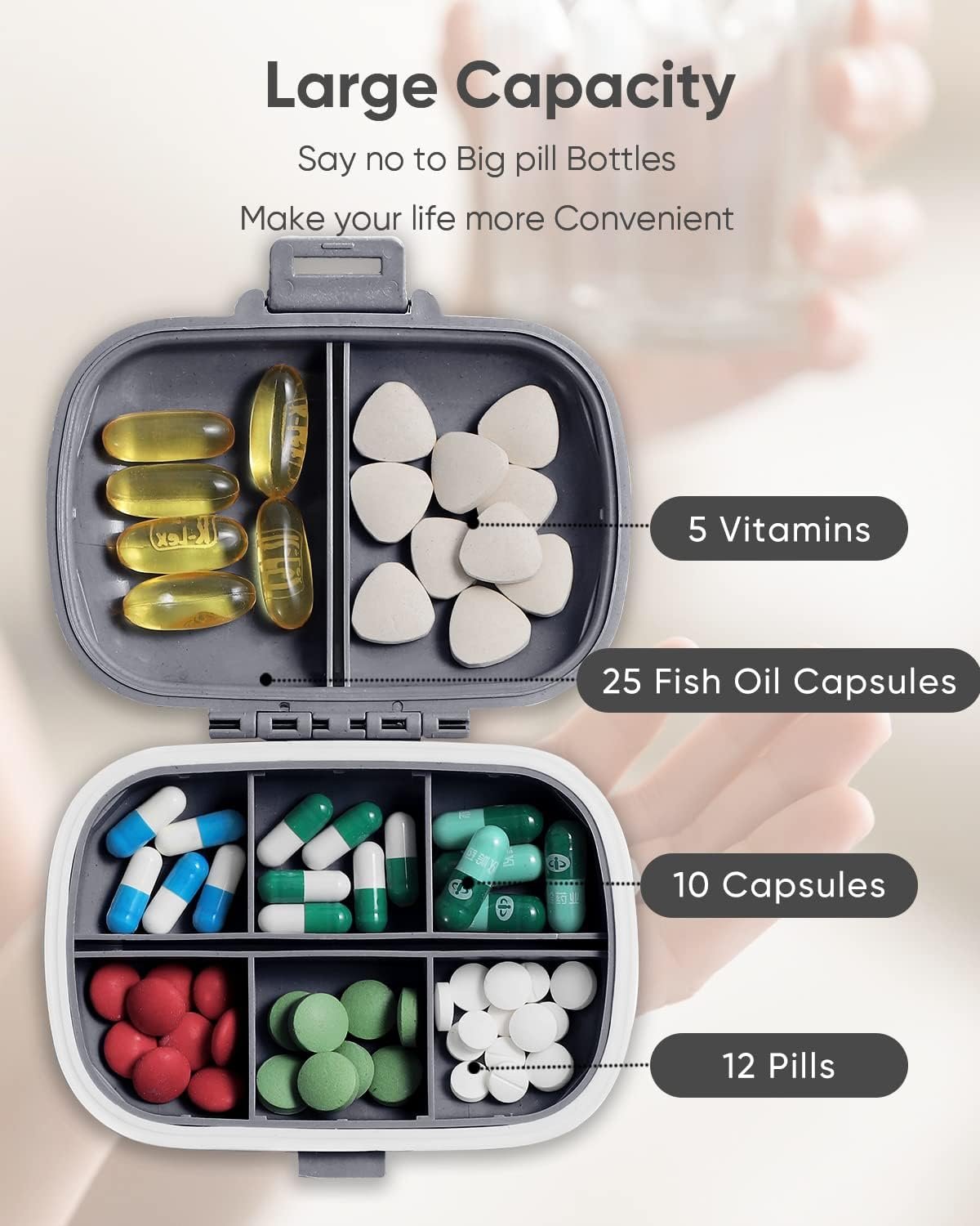 Large Capacity: The daily pill case has 8 compartments (6+2), 6 small chambers for little pills and 2 large chambers for vitamins. Pills of different sizes are placed in compartments of different sizes