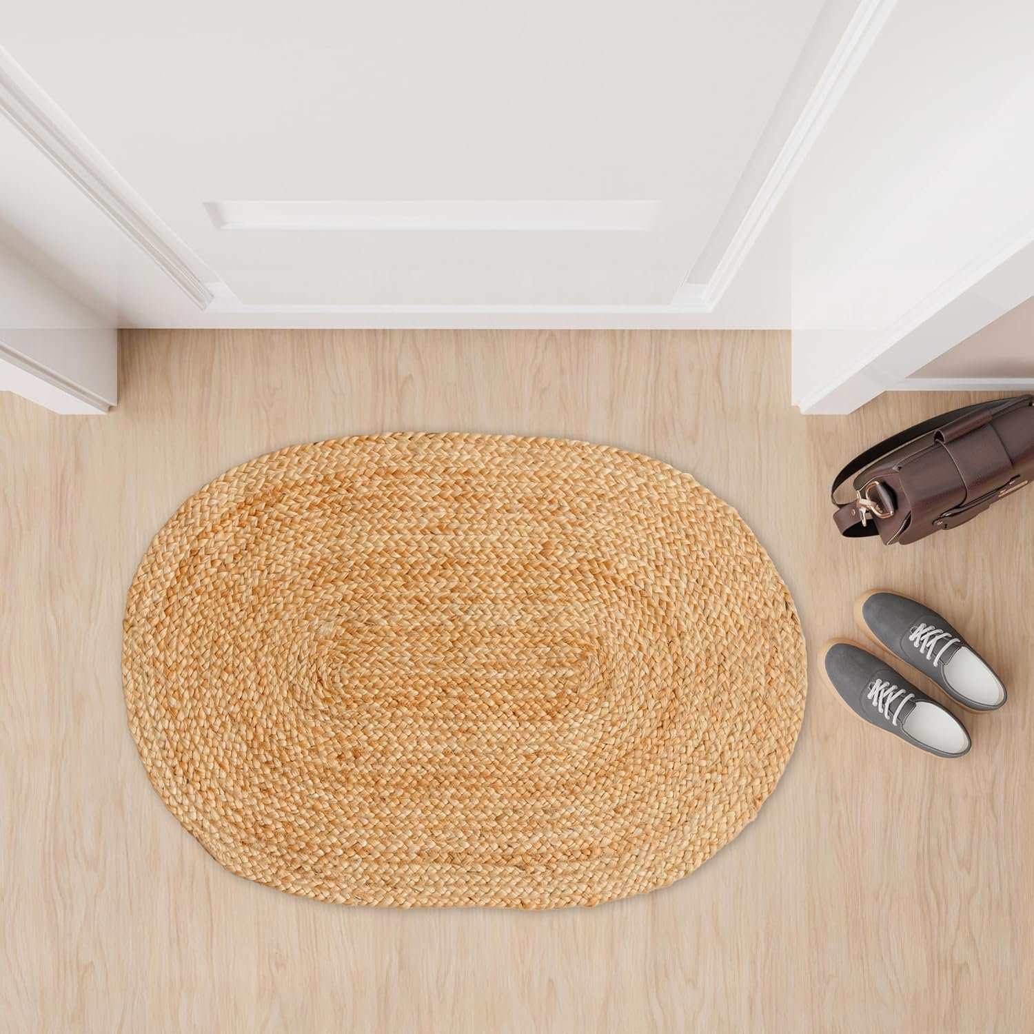 HOMEMONDE Reversible Oval Jute Area Rug – Hand Woven Natural Fiber – Farmhouse Braided Rugs for Entryway/Front Door/Porch/Meditation Mat/Home Decor (2 x 3 ft, Natural)