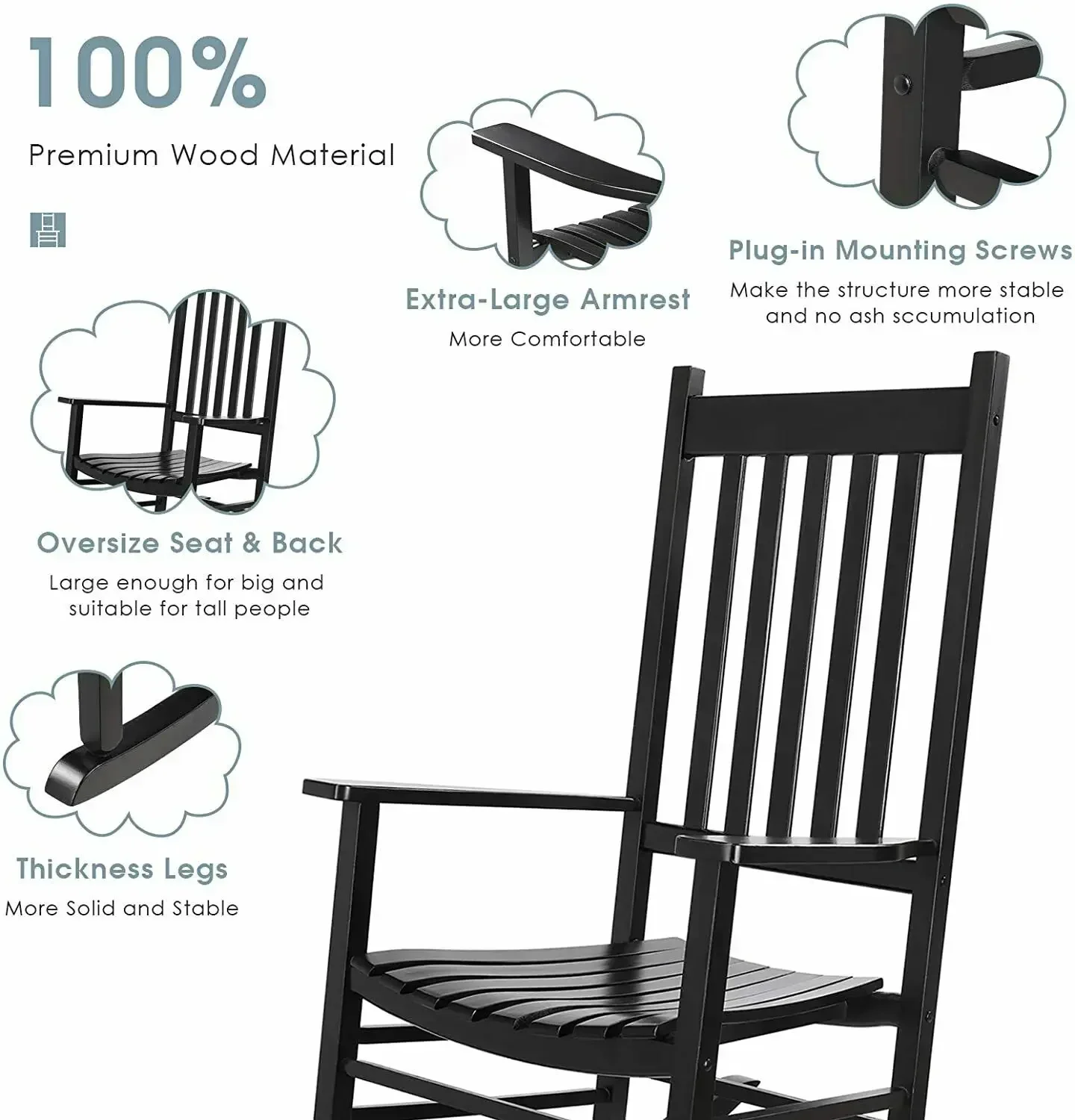 ã€Wooden Rocking Chair】 Oversized Wooden Rocking Chair, Classic Porch Rocking Chair, Weight capacity: 350 lbs. It’s perfect for both indoor and outdoor use in sunrooms, porches, living rooms, dens, bedrooms, nurseries, and more. Smooth, matte surface is perfect for indoor and outdoor use.