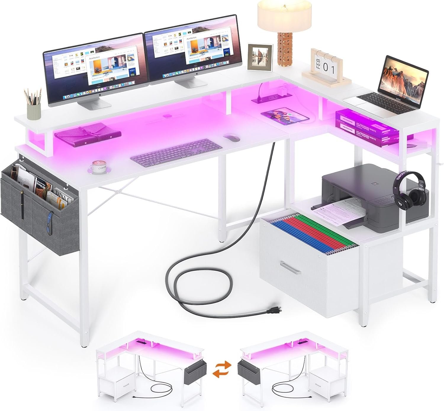 Homieasy Computer Desk with File Drawer Cabinet, L Shaped Office Desk with Printer Stand & Full Monitor Stand, 48 Inch Gaming Desk with Power Outlets Led Light Storage Bag Hanging Hooks, White