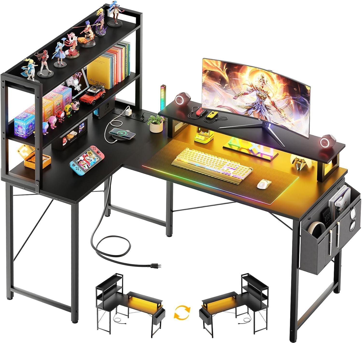 Homieasy L Shaped Computer Desk with Bookshelf, 47 Inch Reversible Corner Gaming Desk with Charging Station & Led Light, Home Office Desk with Hutch Monitor Stand Storage Shelves Bag, Black