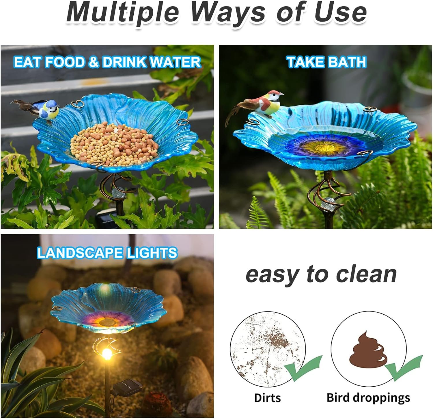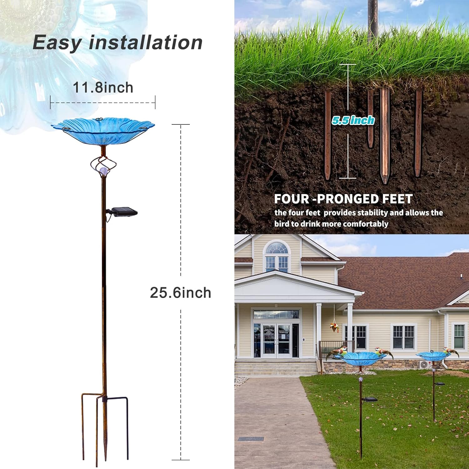 Homight Solar Glass Blue Bird Bath, Yard Art,Garden Outdoor Birdbath with Metal Stake with White LED Light Metal Stake Garden Decor Gifts
