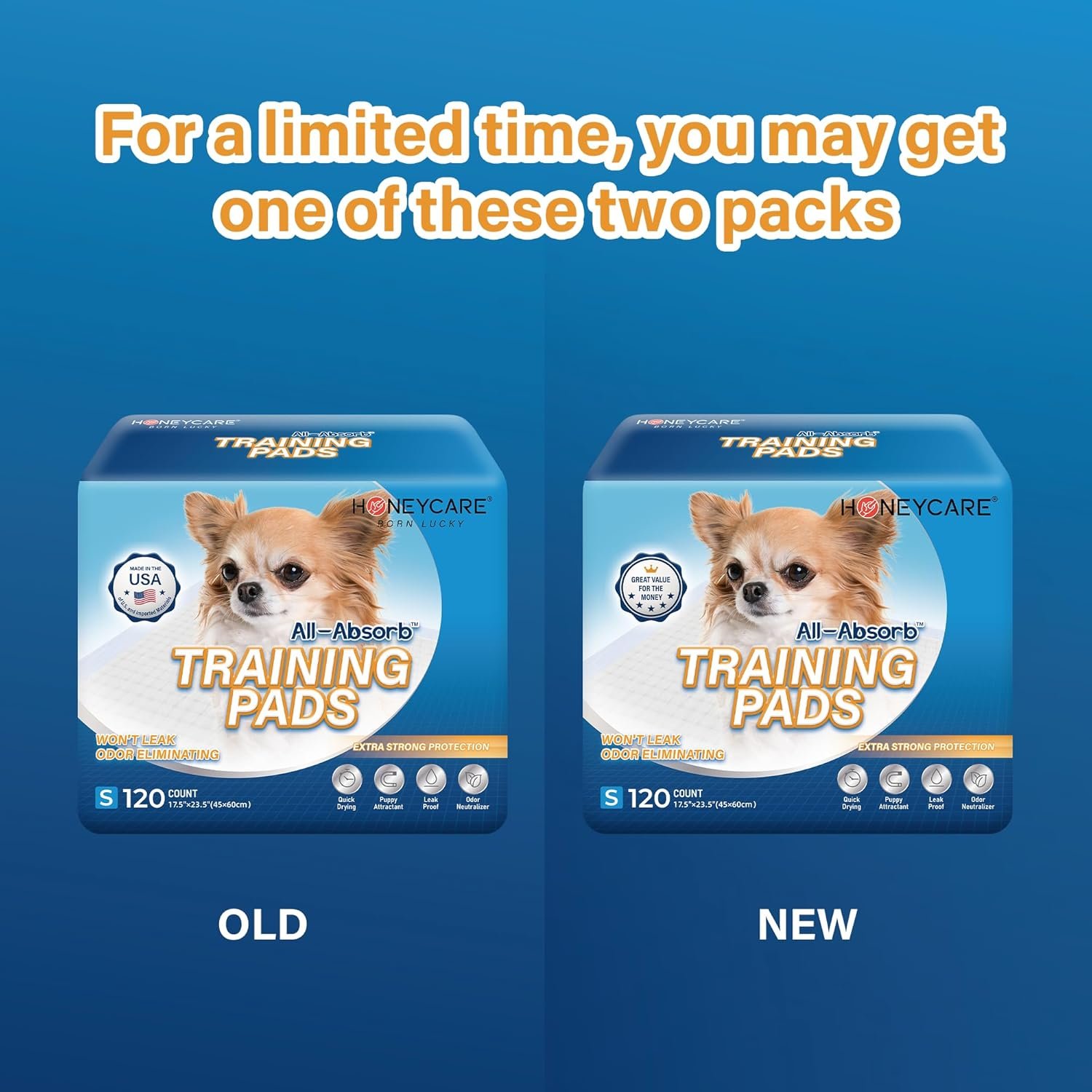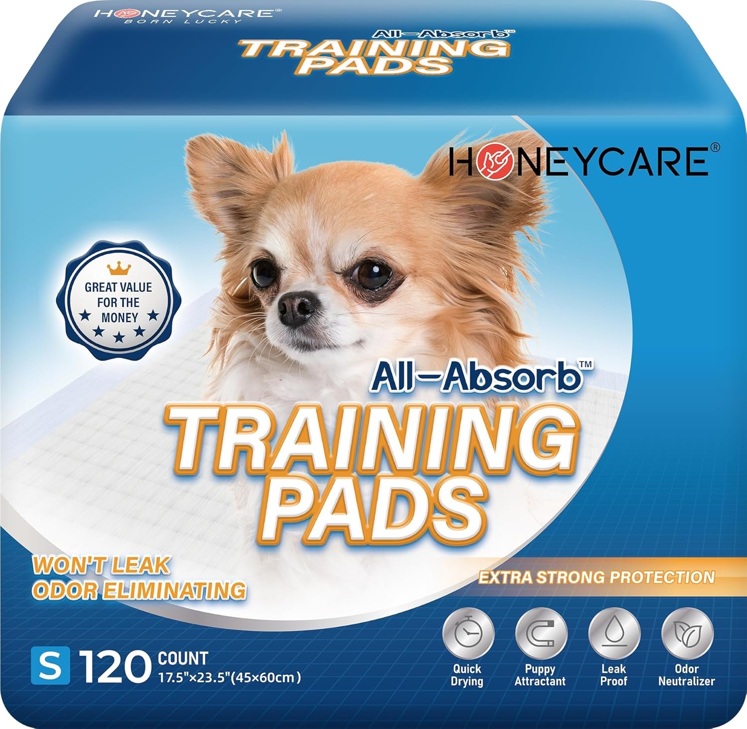Honey Care All-Absorb, Small 17.5″ x 23.5″, 120 Count, Dog and Puppy Training Pads, Ultra Absorbent and Odor Eliminating, Leak-Proof 5-Layer Potty Training Pads with Quick-Dry Surface, Blue, A05
