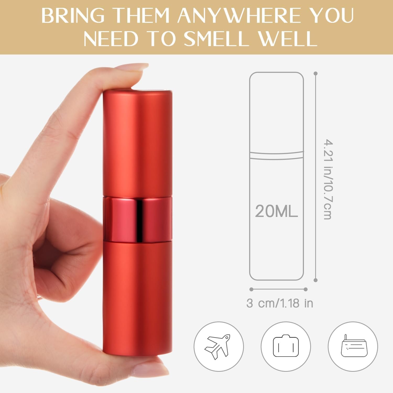 Proper Capacity to Use: the perfume spray bottle is around about 4.21 x 1.18 inches/ 10.7 x 3 cm, and the capacity is about 0.7 oz/ 20 ml, allowing you to store perfume particularly, lightweight and portable
