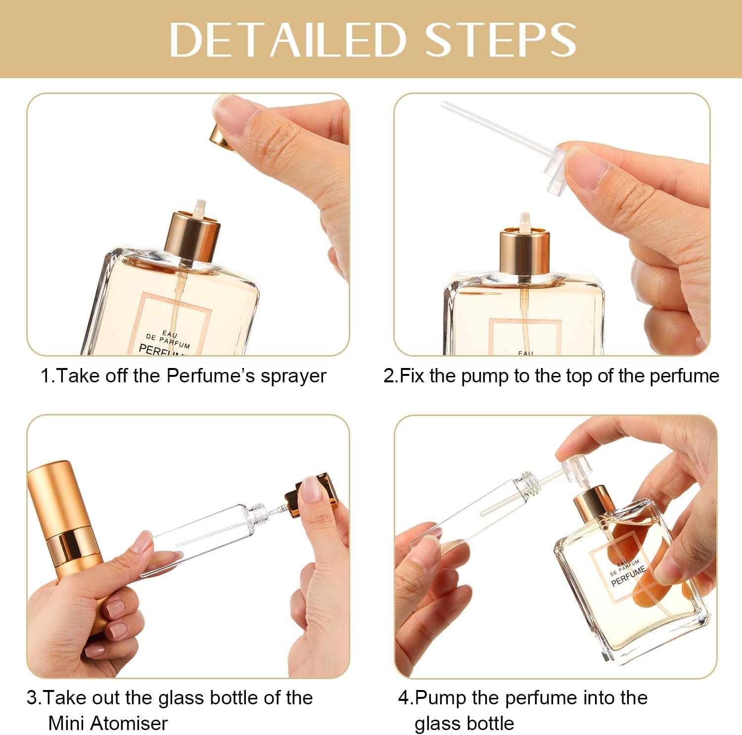 Included with your purchase, the perfume dispenser pump transfer tools facilitate hassle-free refilling. Enjoy the simplicity of keeping your travel perfume bottle topped up with your favorite fragrance, ready for daily adventures.