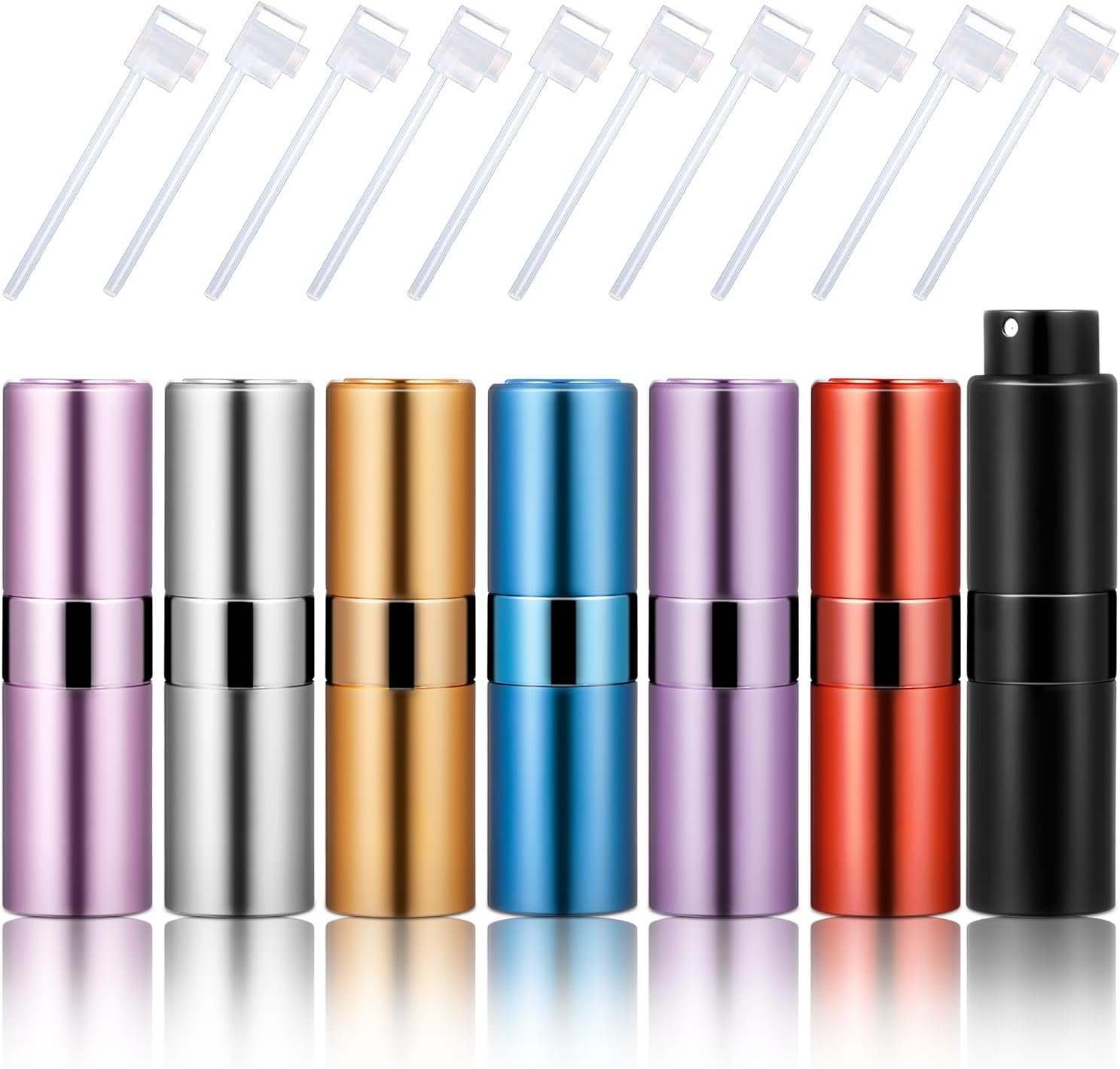 Sufficient Quantity and Color Variety: you will get 7 pieces of large refillable perfume bottles in 7 colors, namely silver, gold, black, blue, purple, pink and matte red, with 7 pieces of perfume dispenser pump transfer tools for easy perfume transfer, enough quantities and various colors to meet your daily use and placement needs