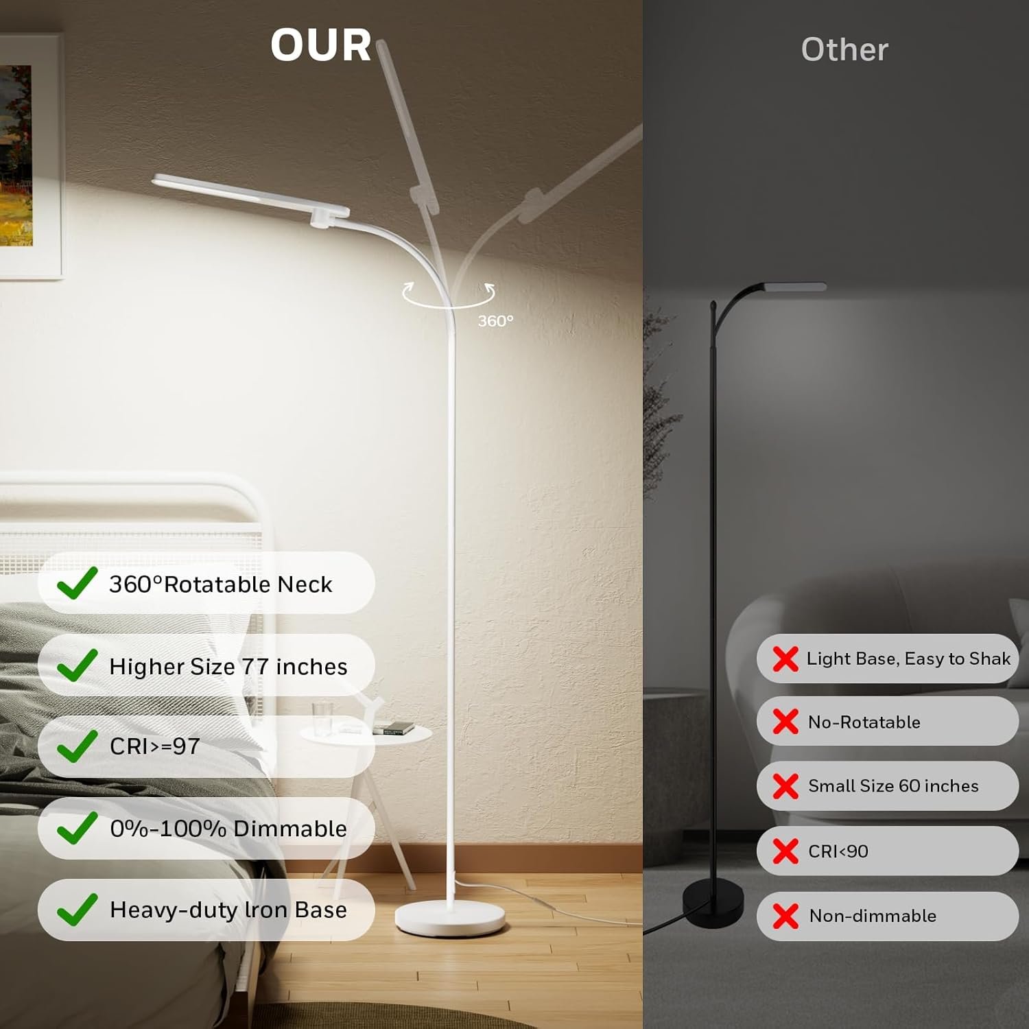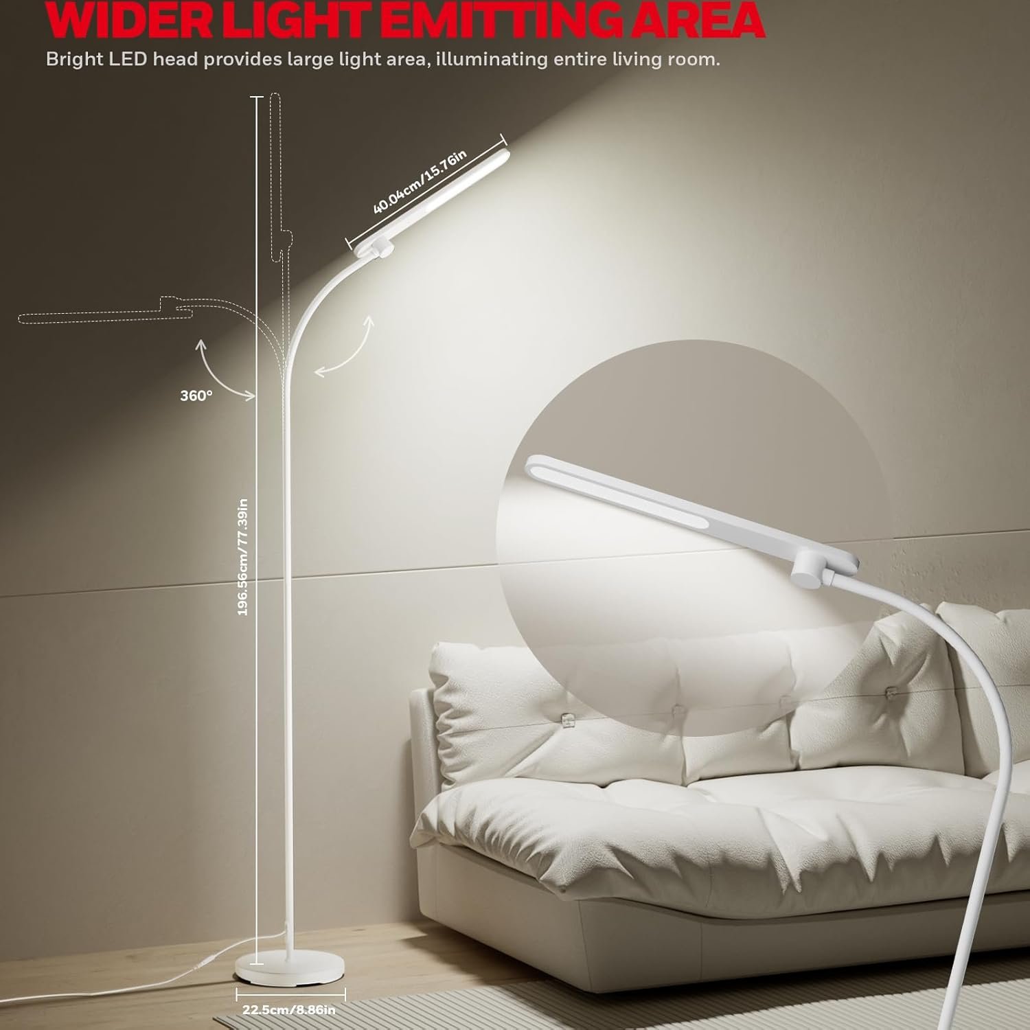 [Extra-Tall, Energy-Efficient & Built to Last] Standing 77.56 inches tall—higher than standard floor lamps—this lamp provides better coverage for larger spaces. With a 30,000-hour lifespan and up to 80% energy savings, it offers reliable daily performance with long-term value.