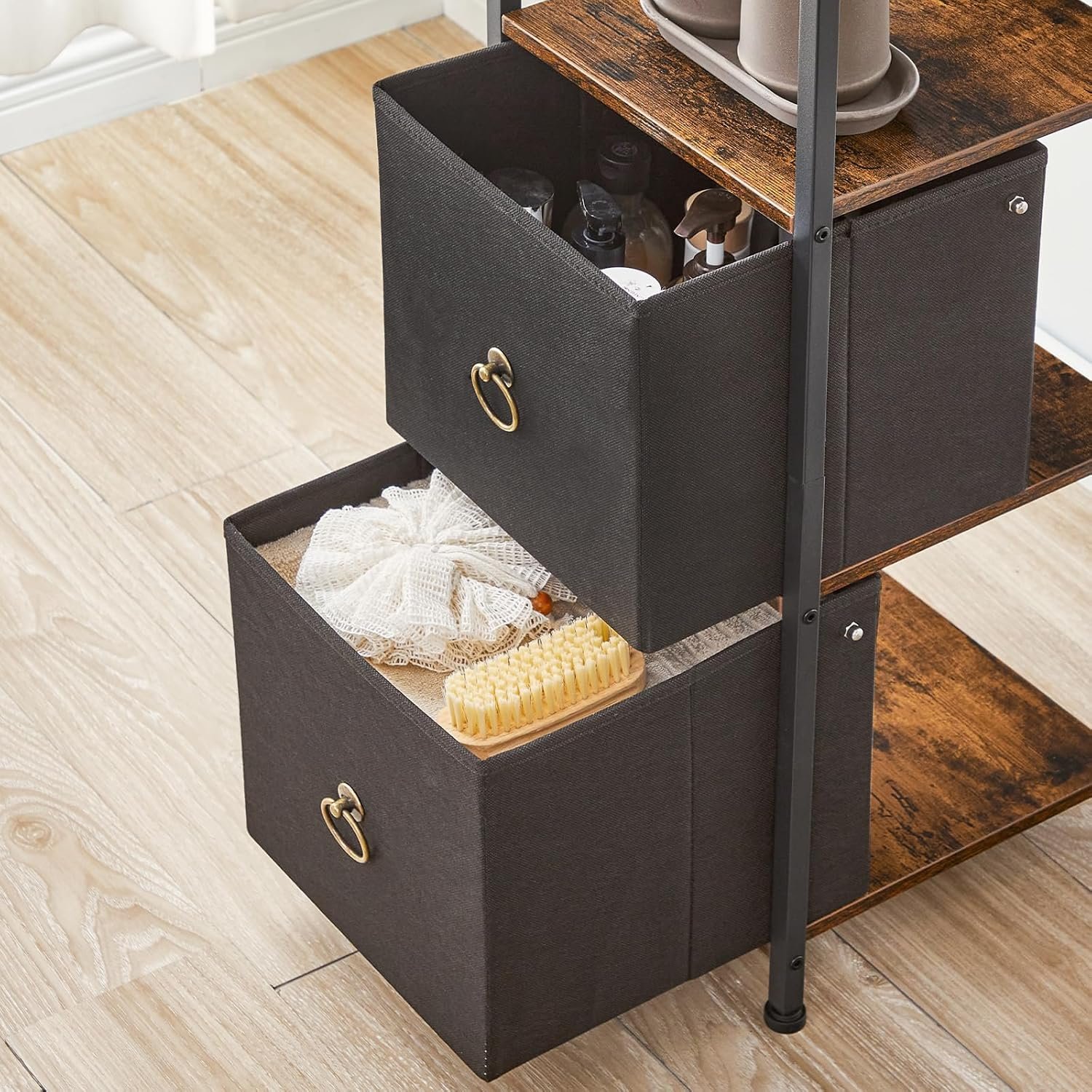 Flexible Drawers: This bathroom floor cabinet has 3 non-woven fabric drawers with detachable design. You can freely place the drawers on any tier except for the top upon your needs or even remove them for a simple wooden storage rack