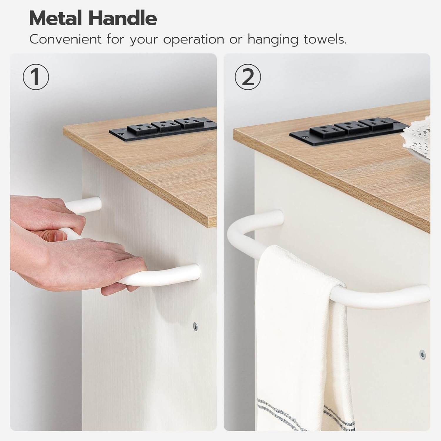 Kitchen Cabinet with Charging Station: This kitchen island with a 15″D x 26″W island top offers you the additional space for your delicious meals. Your microwave oven or baking oven can find the right place to stay and the power strip including 3 sockets and a 59″ long cord facilitates your free charging of various kitchen appliances