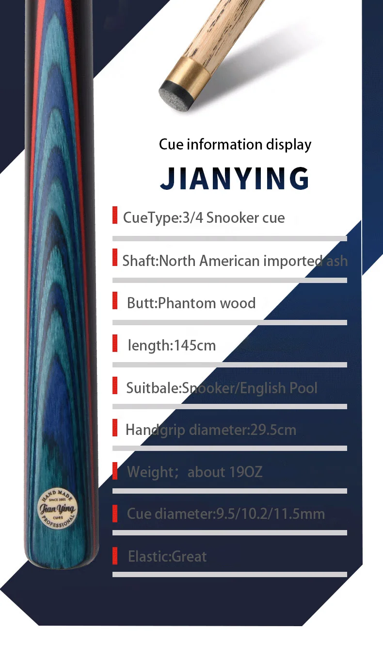 Hot Selling High Quality JIANYING 2-pieces Handmade Snooker Cue 3/4 White Ash Wood Cue Stick for Snooker/English Pool for Sale