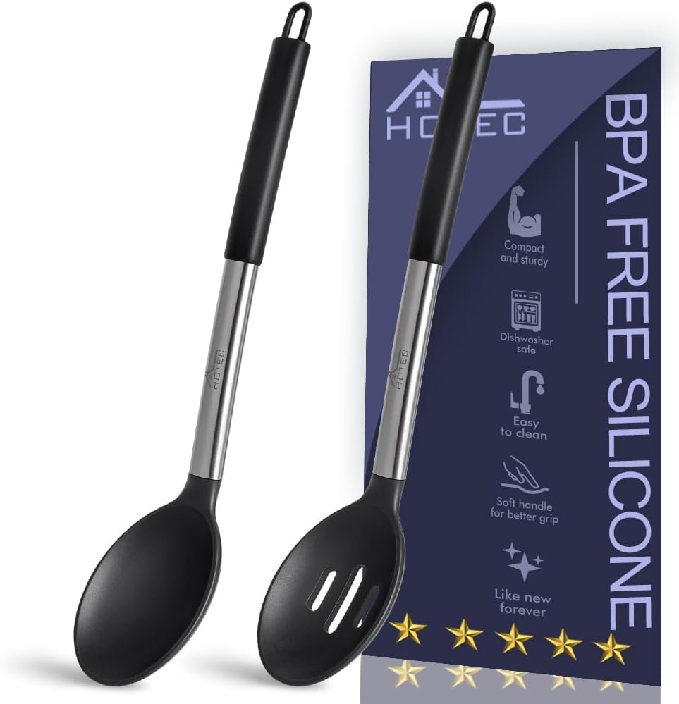 HOTEC 446°F Heat Resistant Large Silicone Cooking Spoon, BPA Free Solid Slotted Spoons, Nonstick Kitchen Cookware Utensils, Mixing, Serving, Stiring Large Spoons, Black