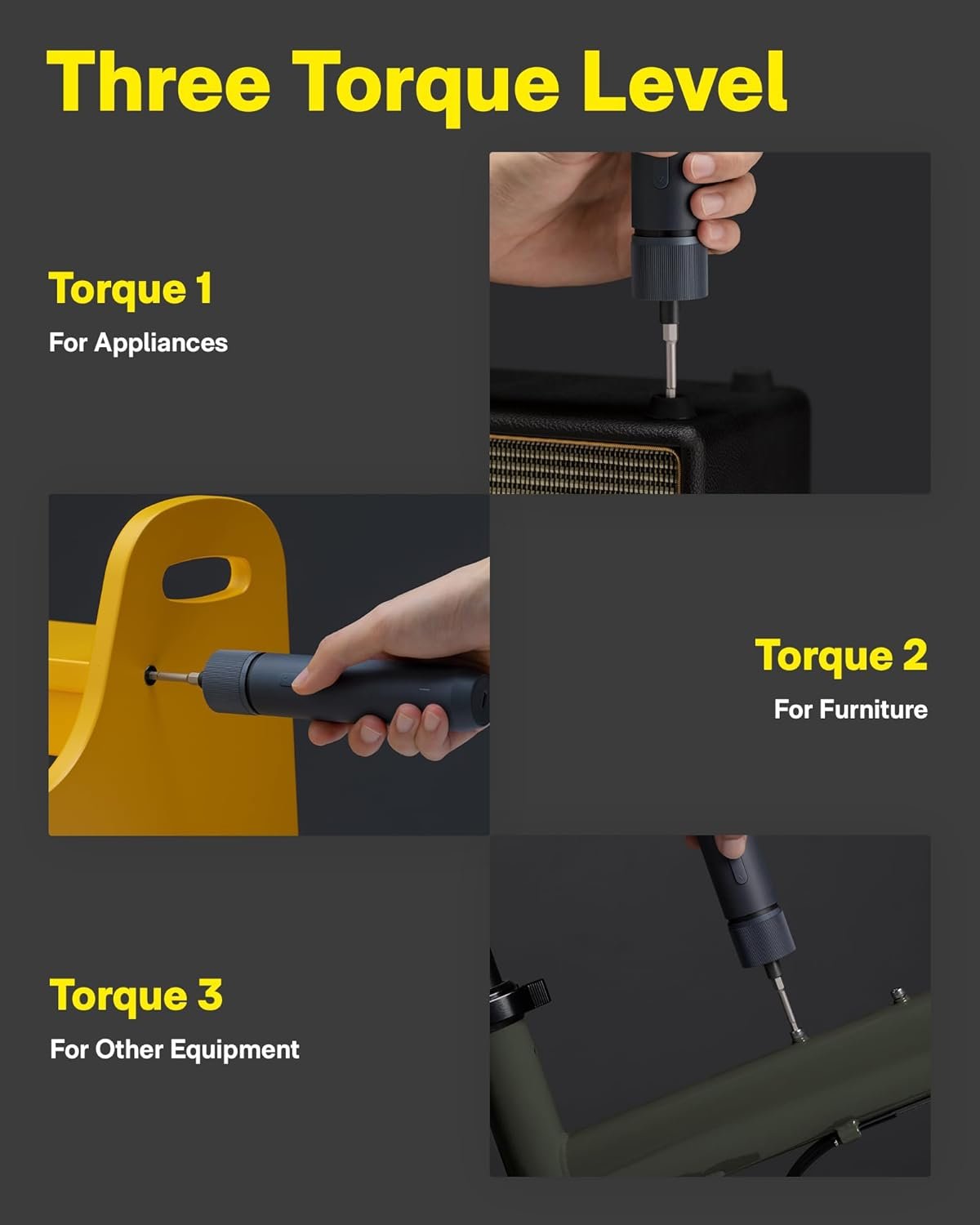 Customers find the screwdriver kit well-made and reliable, noting it can withstand daily use and is extremely useful around the house. The tool is simple to use, convenient for small to medium jobs, and customers consider it worth the money. They appreciate its minimalistic design and elegant appearance. The torque settings receive mixed feedback – while some praise the three levels as insanely good, others mention it’s not enough to tighten fully.