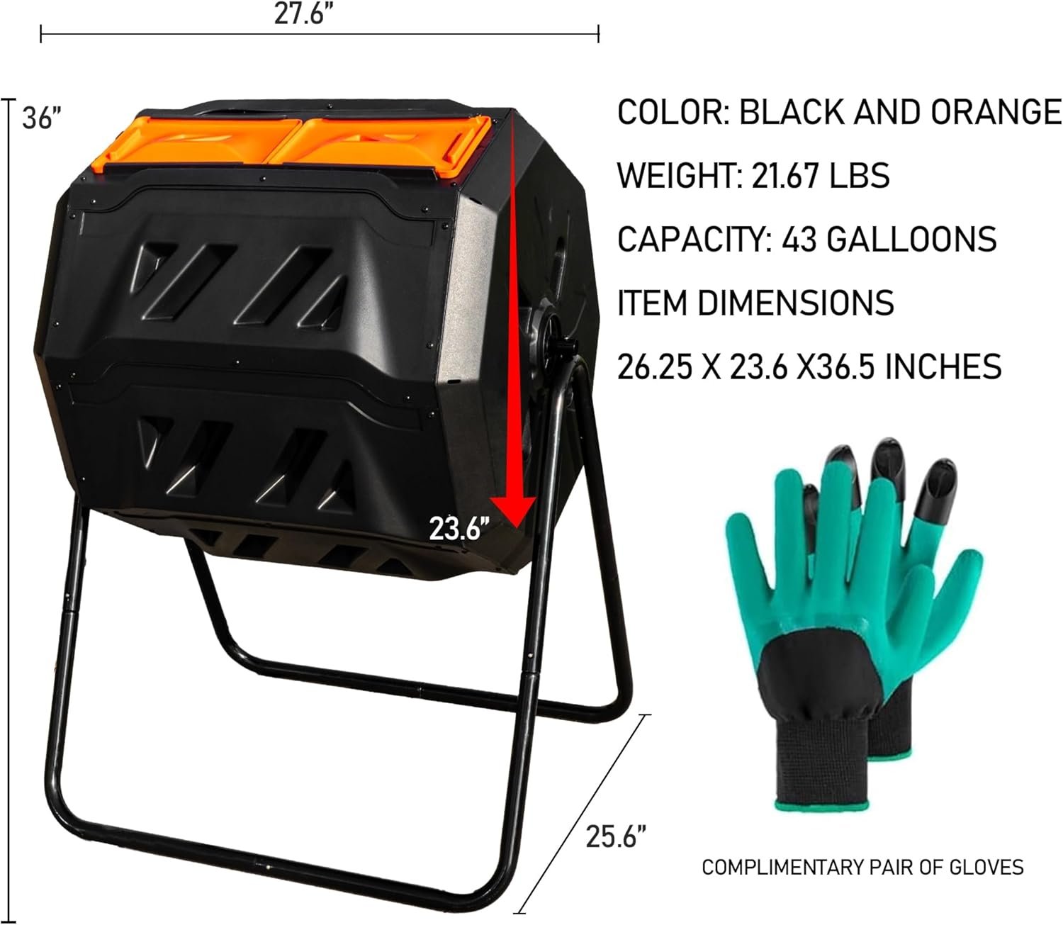43 Gal Dual Chamber Composter: This 43 gallons composter with dimensions of 27.6 × 25.8 × 36 inch. This large tumbling composter makes recycling kitchen scraps a breeze.