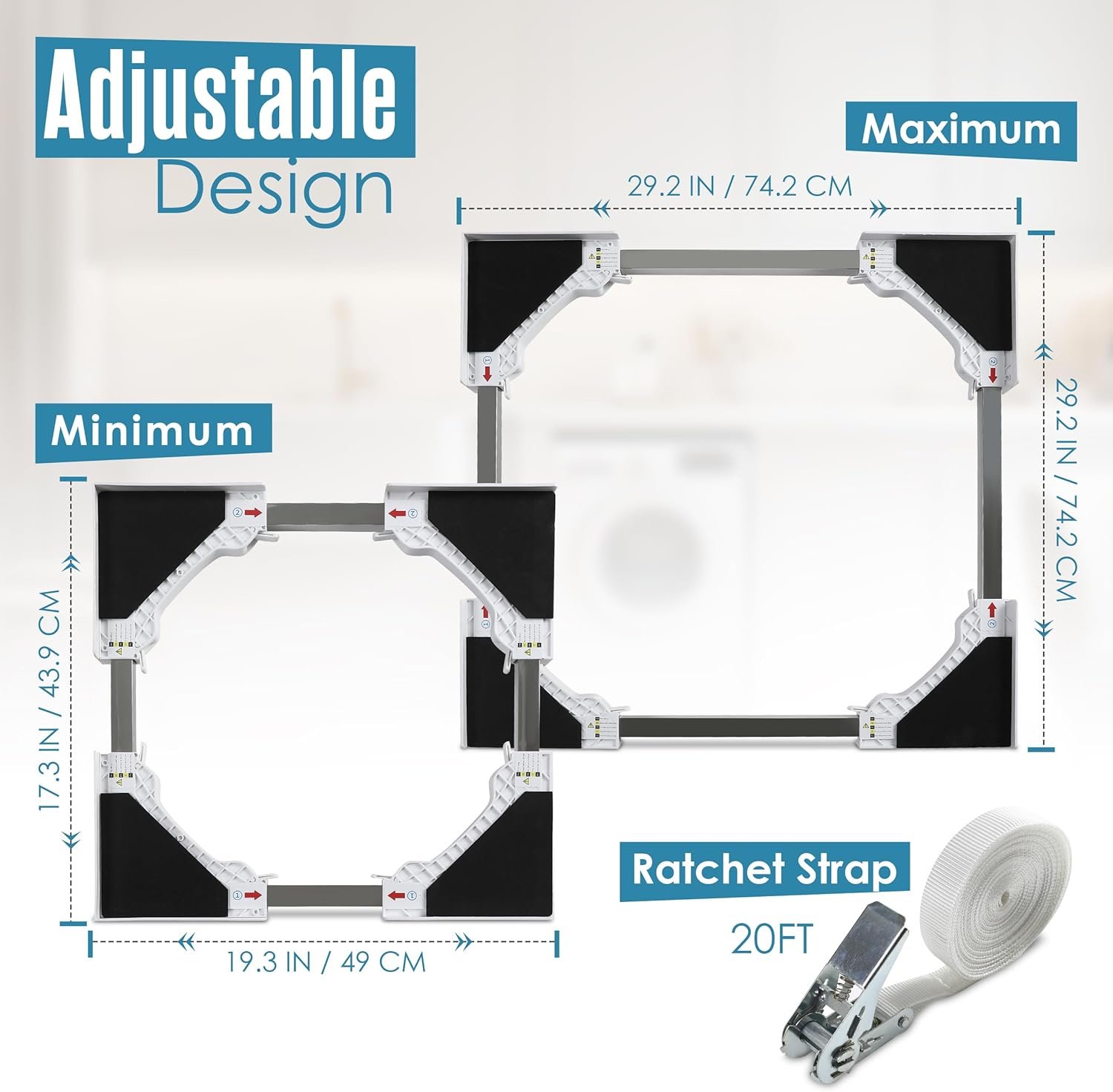 SECURE DESIGN – The adjustable bracket and ratchet strap keep your washer and dryer securely held in place. Anti-slip foam pads add extra stability by preventing movement and reducing vibration.